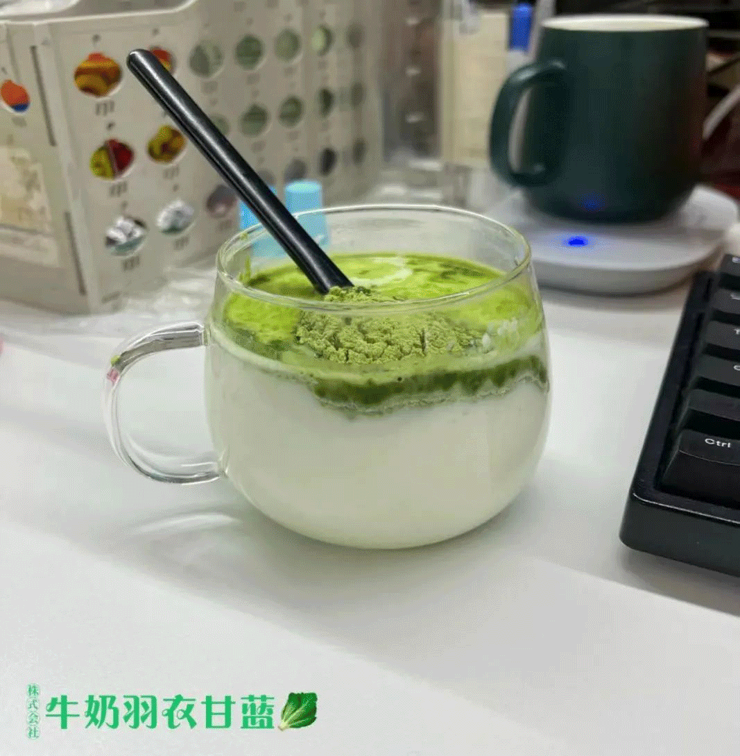 有时我会把它泡在牛奶里,再加点冰块,成本5块钱的“抹茶拿铁”就做好啦~