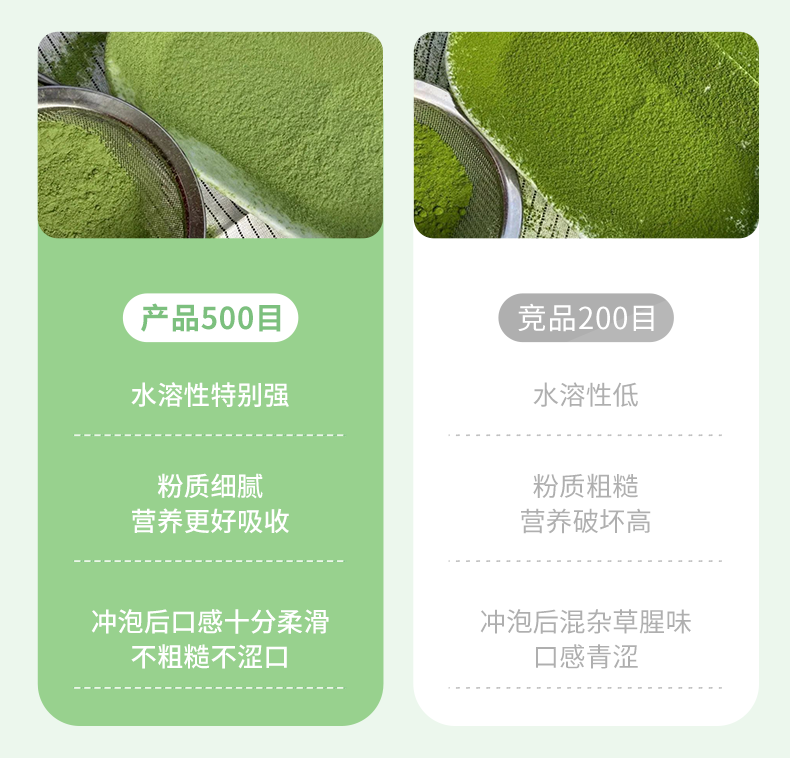 与市面上普通的200目羽衣甘蓝粉对比,简直完胜!