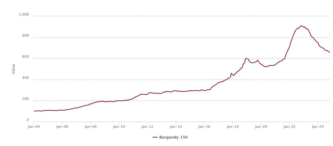 2023年10月,在文章《勃艮第涨不动了》中,我们也再次提示过,勃艮第价格将继续回落,这些预测也都一一验证:“在2022、2023连续两个丰产年份和全球整体经济不景气(尤其是中国)的双重作用下,暴涨到高不可攀的部分名庄价格已有回落,先前涨价越快越狠的,现在回落也越凶。”