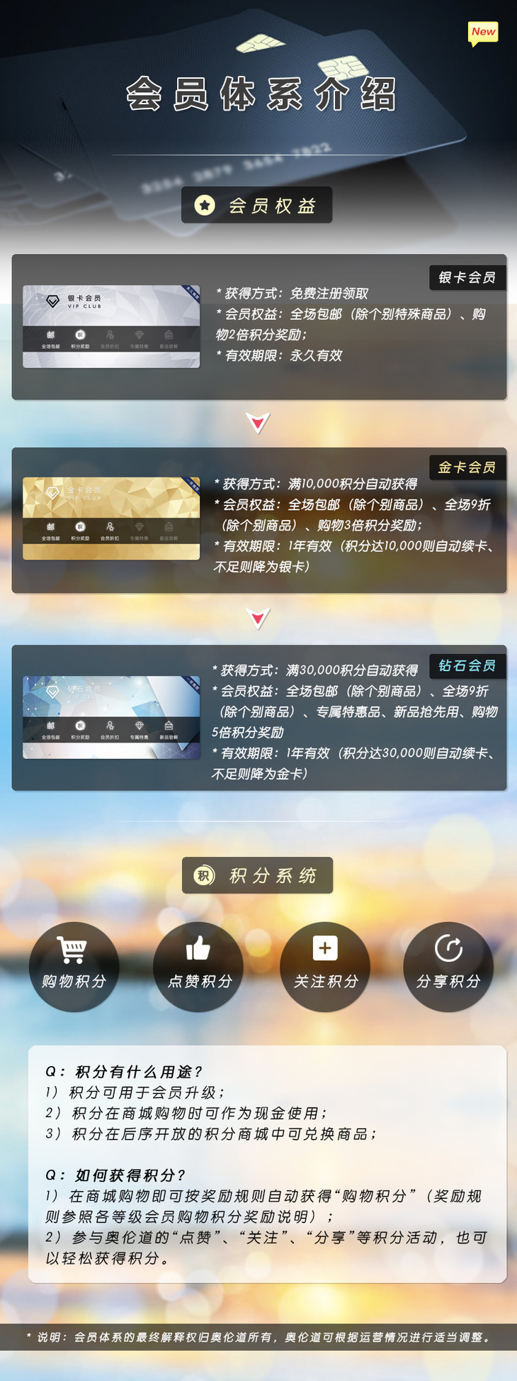 5)新用户:可免费领取新会员体系下的“银卡会员”,享受全场包邮、积分奖励权益、并支持积分会员晋级;