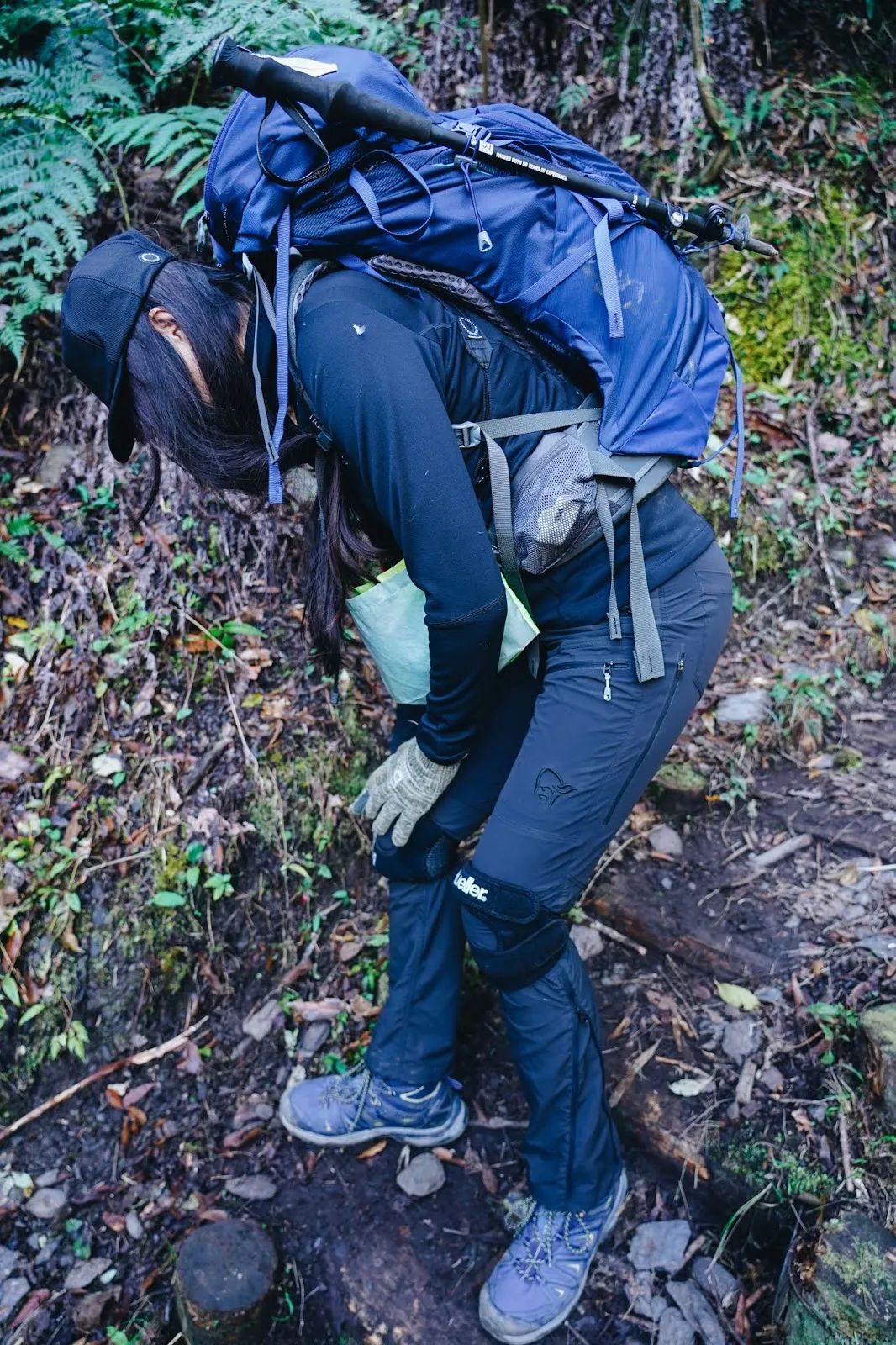 第二天才开始有爬坡,往松山过去几乎都是上坡,过松山后是连续陡下,下到大腿都开始发抖后终于抵达久违的水漾森林。在树林里钻的时候,无论侧身、抓绳或上下坡,都很明显感受到背包牢牢贴在身上,像是穿一件很重的外套在身上而已。
