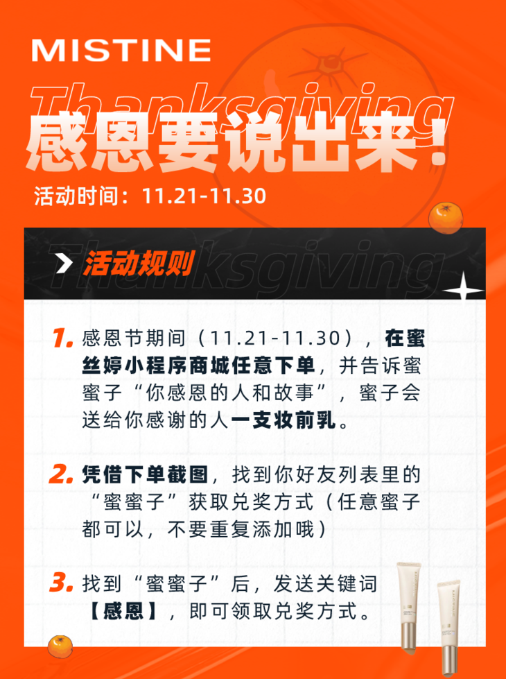 只要你于感恩节期间(11.21-11,30),在蜜丝婷小程序商城任意下单,并向蜜蜜子讲述你感恩的人和你们故事,我们将替你向TA送出一支妆前乳。