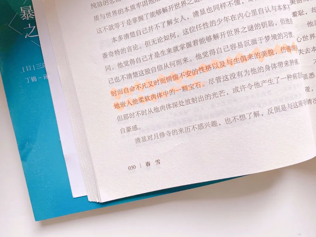 “在清显的眼里,宽敞的裙裾那秀媚的洁白,如同飘忽不定的云彩掩映的山顶积雪,在自己眼前时隐时现。这是他生来第一次发现女人之美令人目眩的优雅本质。”