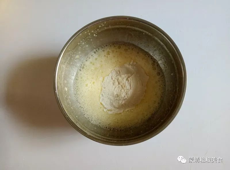 往蛋黄液里加入过筛过的小米粉(低筋粉)