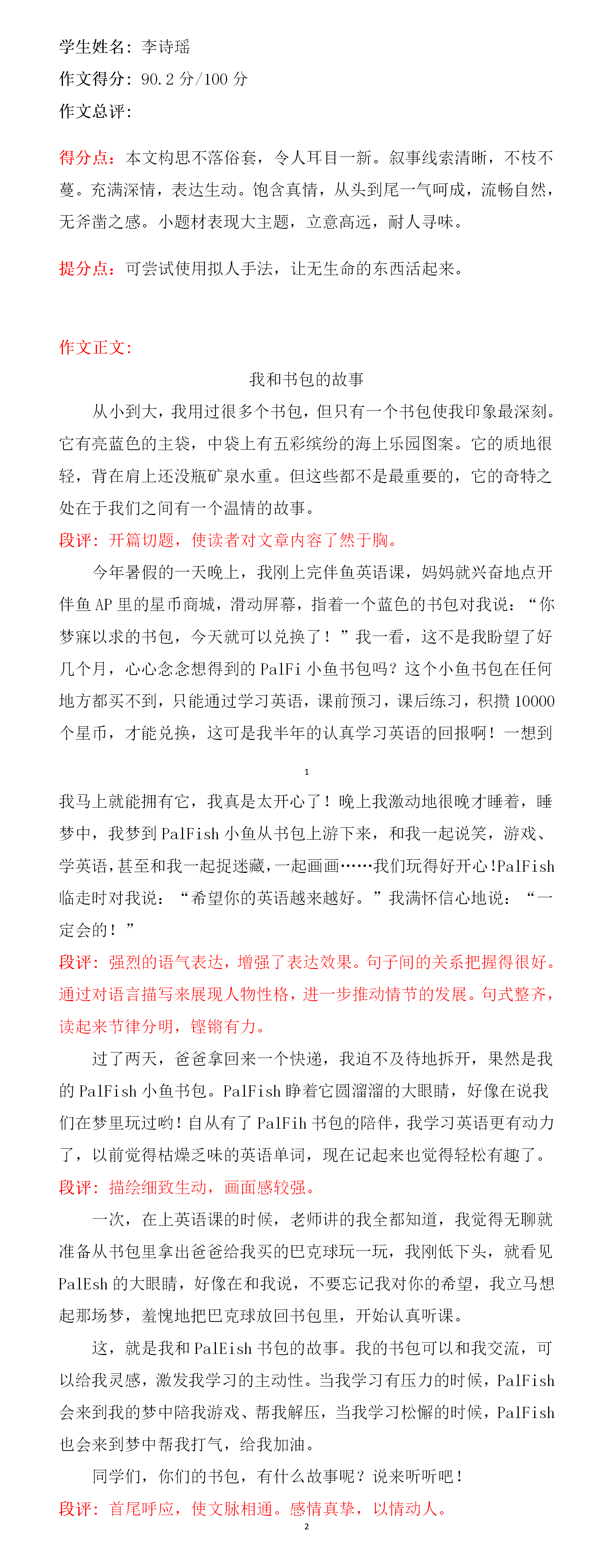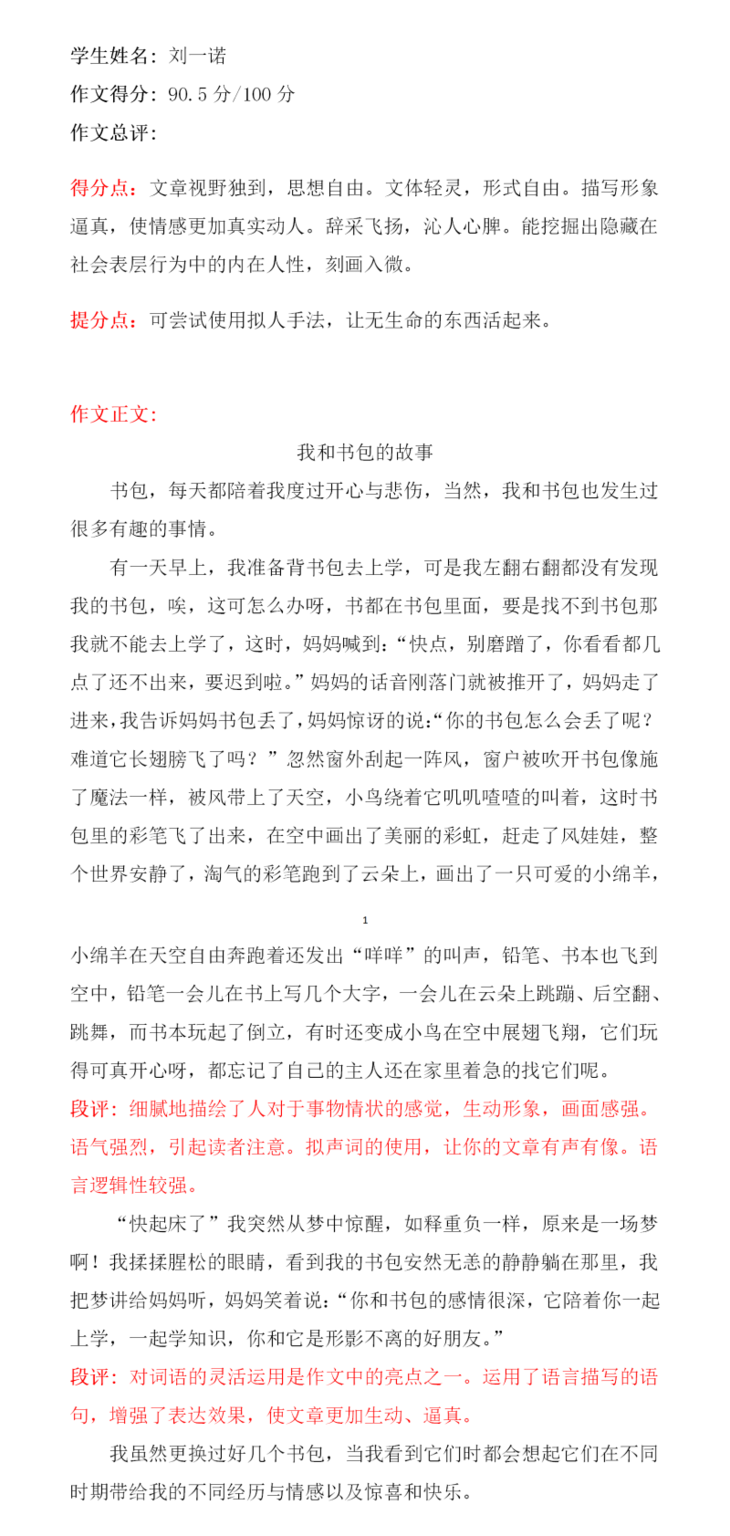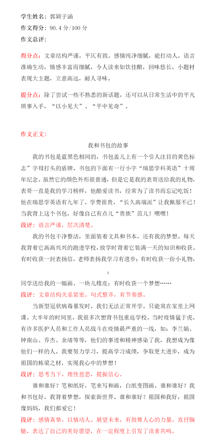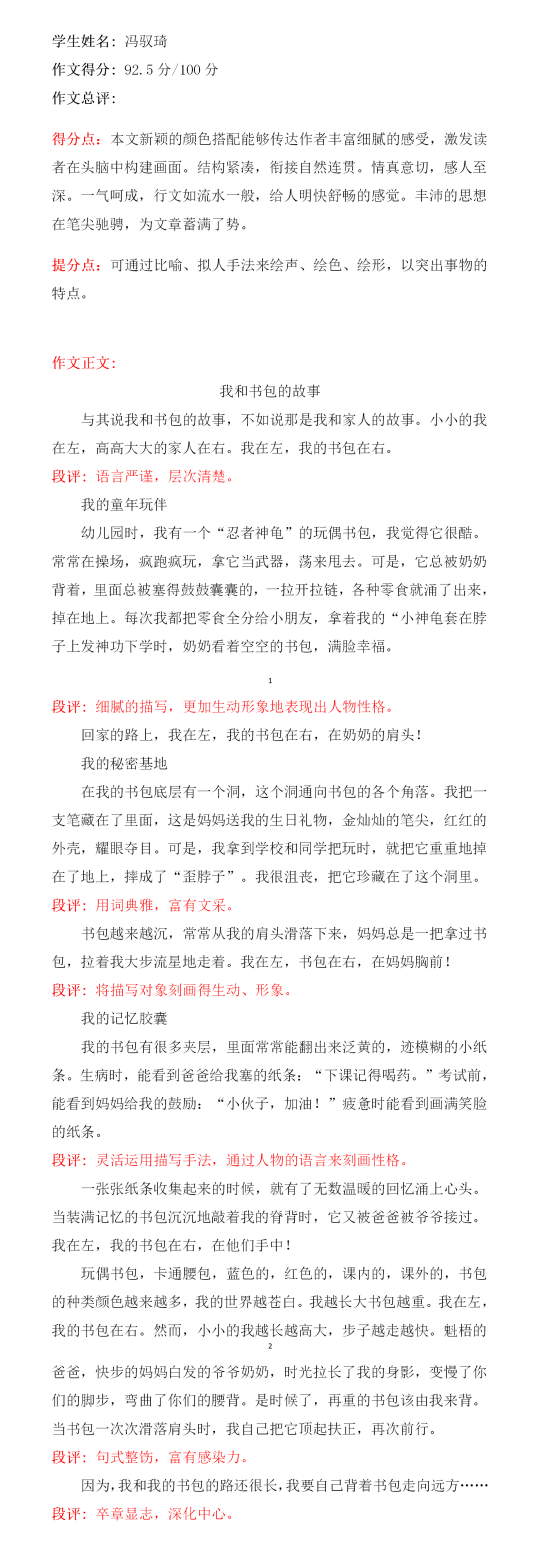 李诗瑶这篇作文,选材比较新颖,不是写爸爸妈妈花钱买来的书包,而是选了一个靠自己努力学习英语兑换来的书包。立意较高,从书包的来由、以及睡梦中与书包上的图案小鱼的交流,暗暗下决心要好好学习,不走神。开头结尾遥相呼应,是一篇不错的习作!希望再接再厉,继续写出更好的作品!
