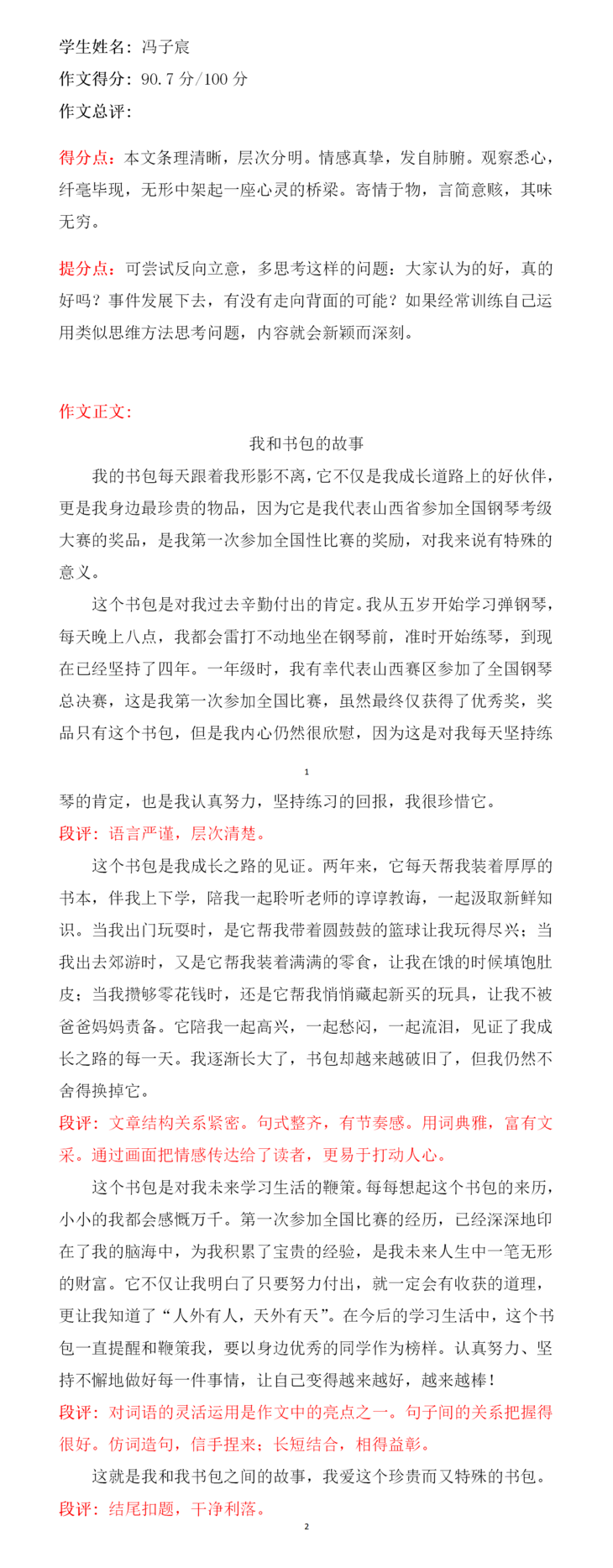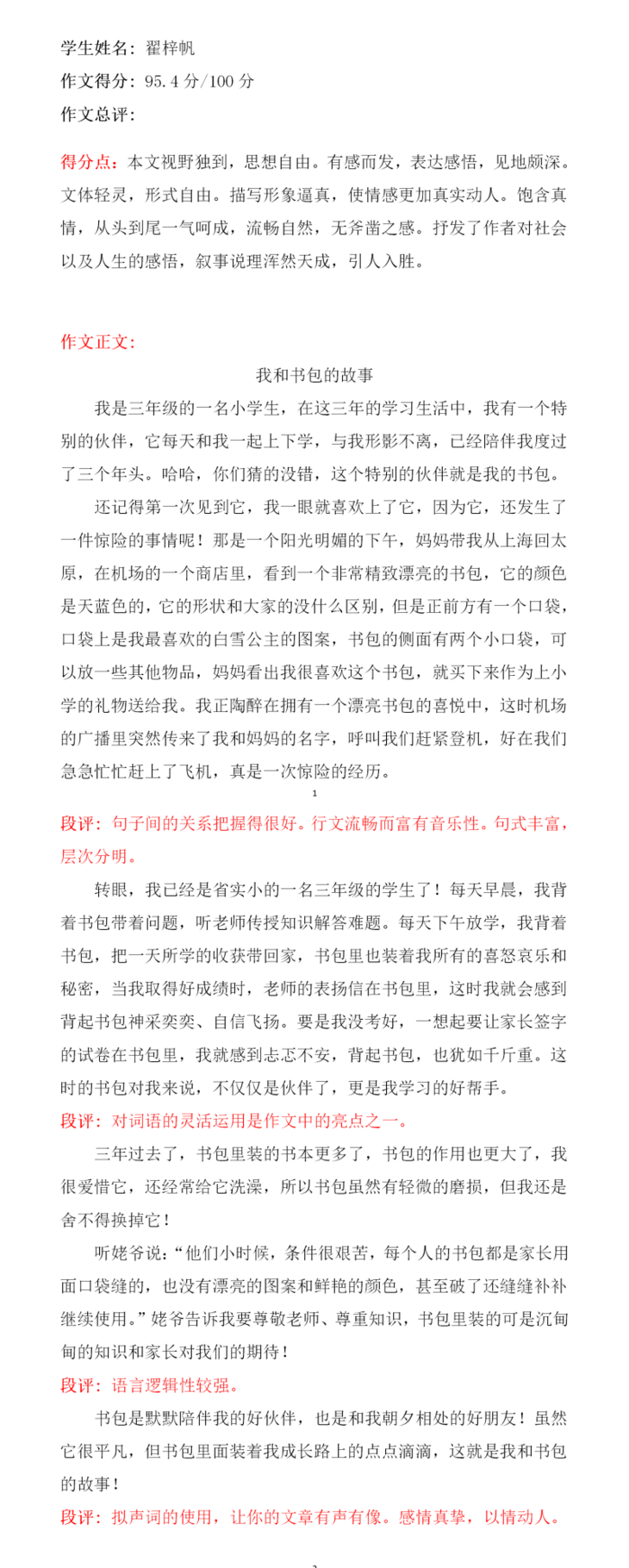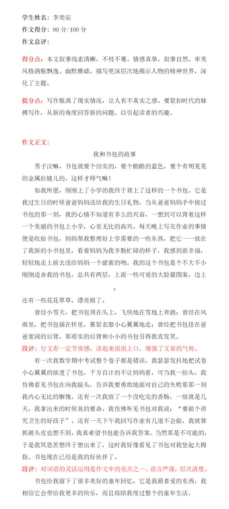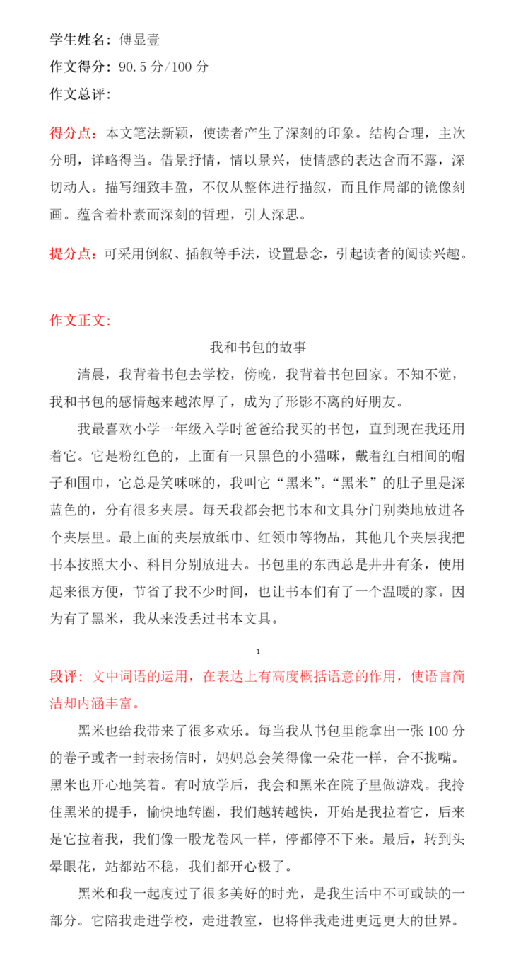 李诗瑶这篇作文,选材比较新颖,不是写爸爸妈妈花钱买来的书包,而是选了一个靠自己努力学习英语兑换来的书包。立意较高,从书包的来由、以及睡梦中与书包上的图案小鱼的交流,暗暗下决心要好好学习,不走神。开头结尾遥相呼应,是一篇不错的习作!希望再接再厉,继续写出更好的作品!