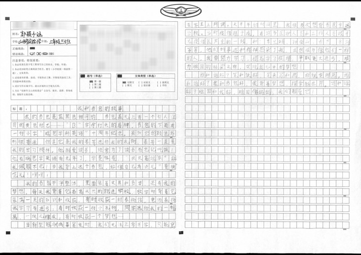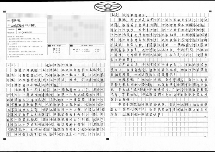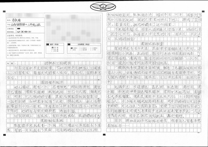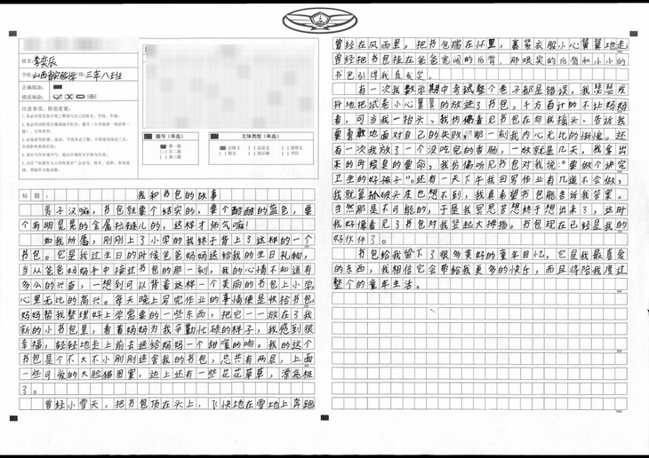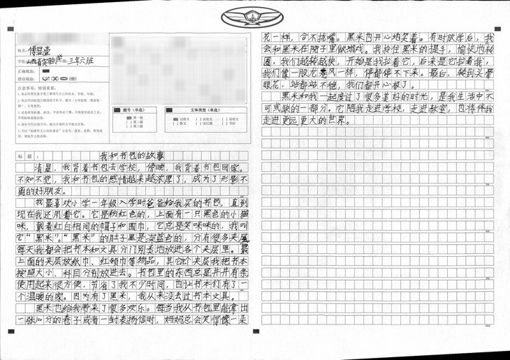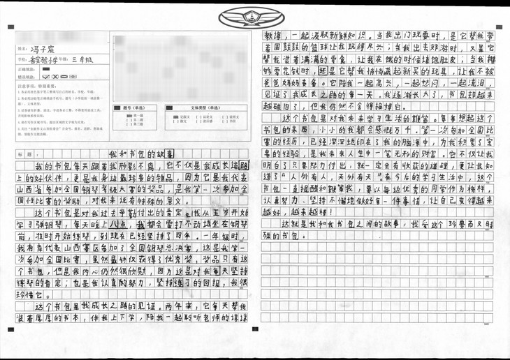 拿到作文题目后,我没有着急动笔,而是静下心来先思考,再拟好提纲,最后才落笔开始写作。文章开头开门见山,揭示主旨,中间从三个方面分别阐述主题,最后结尾再次点题,照应开头,表现了我对这个书包的珍惜和爱护。