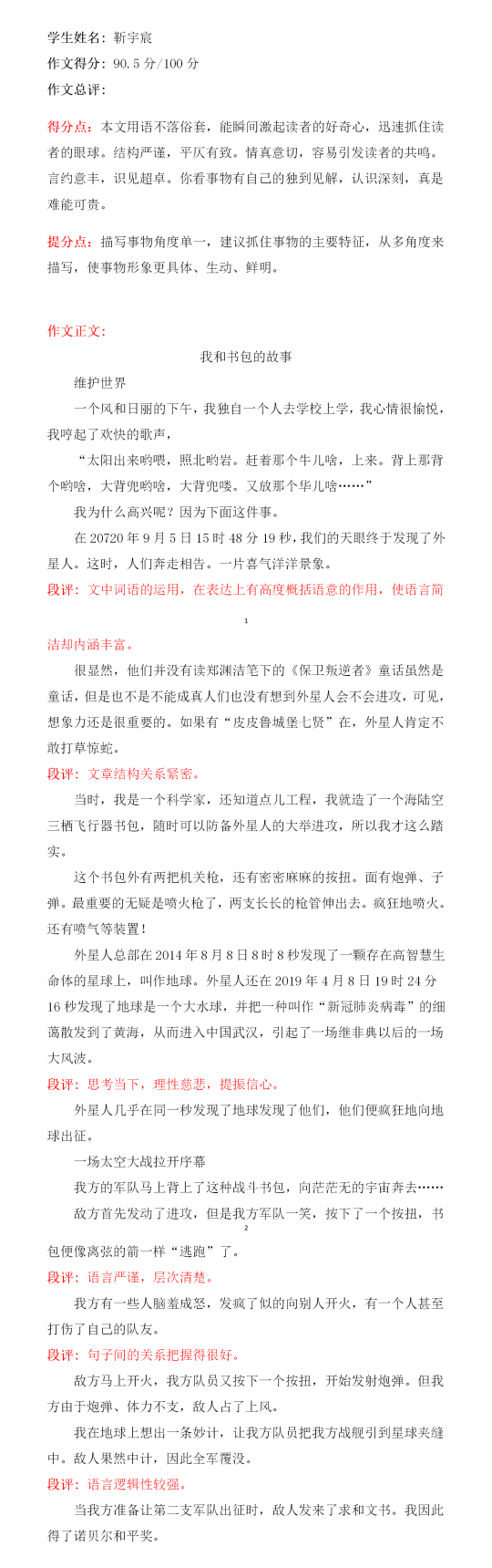 这是一篇富于想象又关乎现实生活“新冠病毒”的小习作,从上学路上的愉快心情引入主题,巧妙地将文学与科学有机的结合起来,设造了一个神奇的书包,它可战胜外星人带给人类的一切灾难。文章生动有趣,想象奇特,可见小作者阅历丰富,善于思考,是一位博学善用的“小文人”。