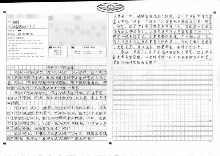 用朴实的语言,给我们介绍了他和书包的故事,字里行间透露着作者对书包的喜爱之情。文章构思巧妙,叙述完整生动,用孩子气的语言叙述,使文章充满了童真童趣。能够抓住主题,对细节描写比较深入,继续坚持练习,会对你今后有巨大帮助。