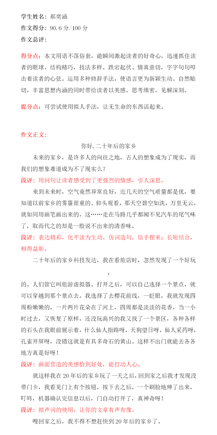 真没想到,孩子的想象如此丰富,你勾勒出一个未来家乡的美好景象,看的我们家长也好想去未来看一看。清新的空气,高科技的智能生活,这不都是我们现在所期望的、努力实现的梦想么?亲爱的孩子,你太厉害了,愿你在未来的时间里,努力奋斗,实现你所有的梦想,加油吧!少年!
