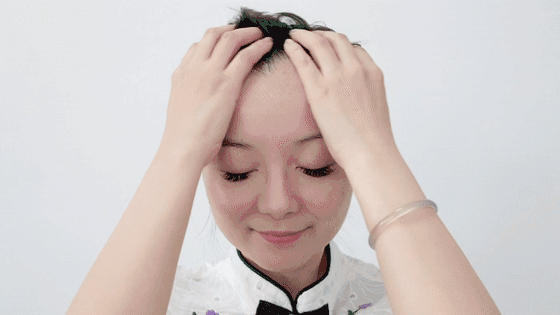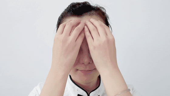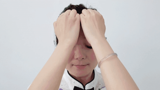 3、用手指沿前额往后脑勺处按压,重复3次;