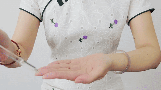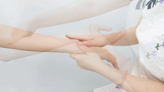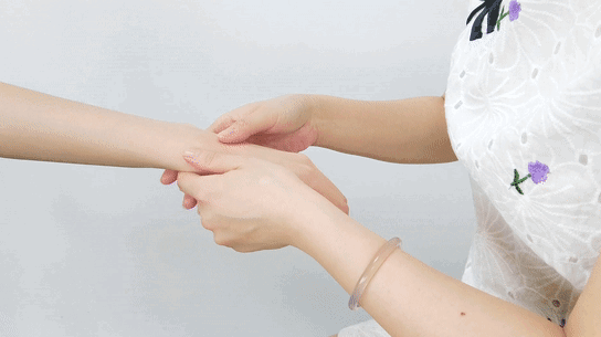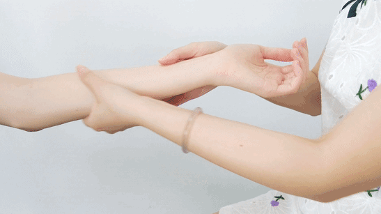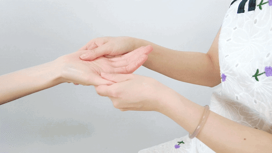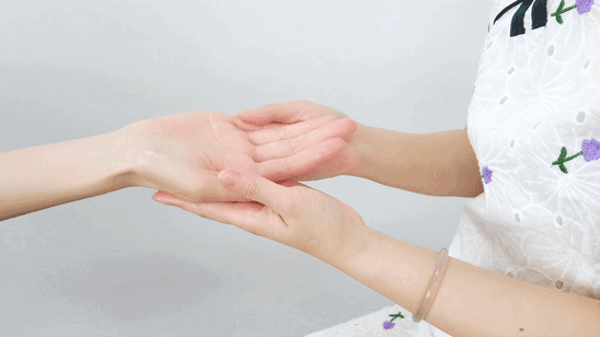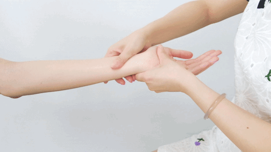1、滴3~5滴精油,涂抹整个手部,用双手拇指从内向外放松手背;