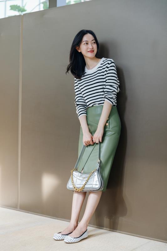 牛油果绿的修身裙颜色真的很时髦,搭白衬衫和西装很有大气明丽的复古氛围~皮质柔软舒适,裙子版型修身显腿长~