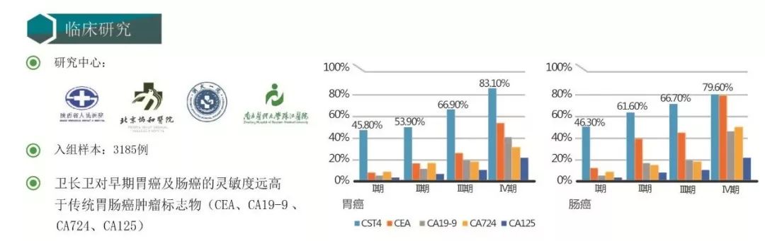 以入选国家863课题的CST4检测项目卫长卫为例,据国家863课题显示:CST4对于胃癌和肠癌检测的灵敏度、特异性以及整体诊断的准确率均远远高于其他传统标志物,尤其对消化道肿瘤的早期发现具有重要的临床意义。