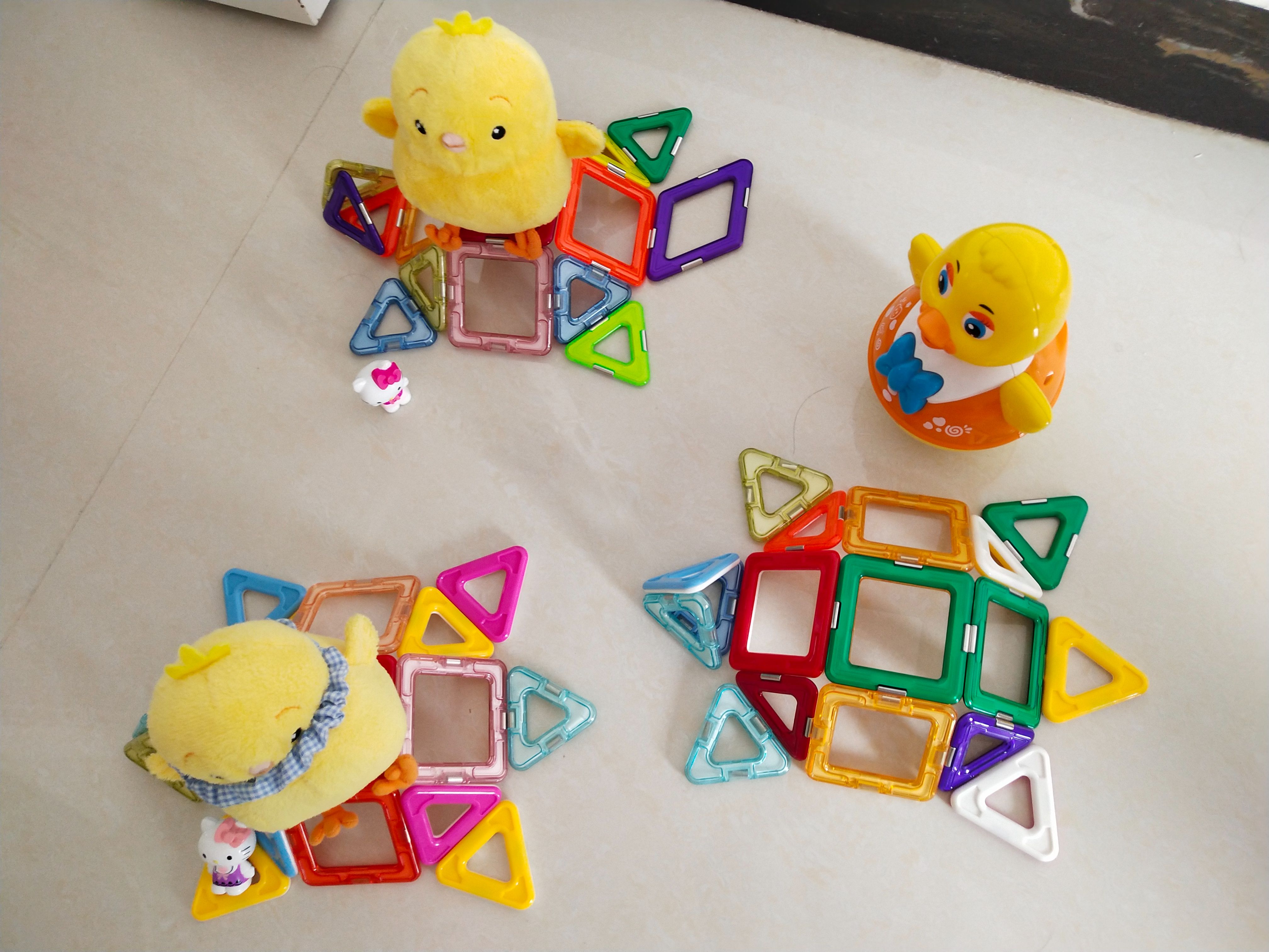 因为之前用磁力片搭过乌龟,所以小姑娘就非让再搭三只乌龟驼小鸡球球和他的朋友过河,然后小姑娘又找了半天,翻出两只球球和一只小鸭子,就用小鸡球球带头绳客串一下我们的小鸭嘎嘎,玩的特别开心。