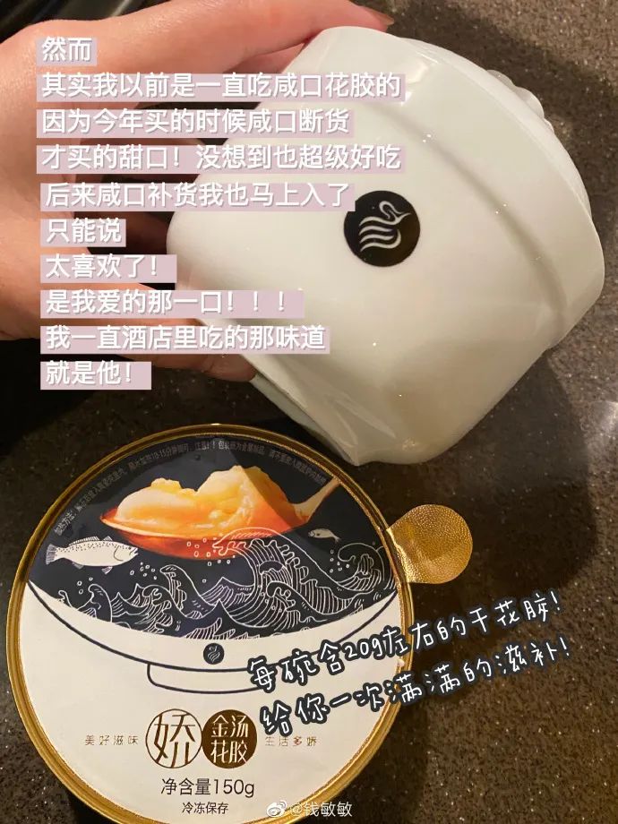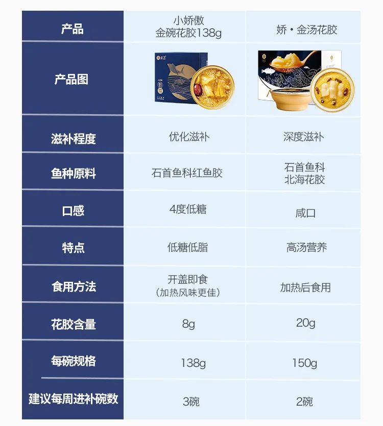 小骄傲花胶是入门级的,娇金汤花胶是深度滋补的。如果你吃得惯,小喇叭建议娇金汤花胶长期吃喔。