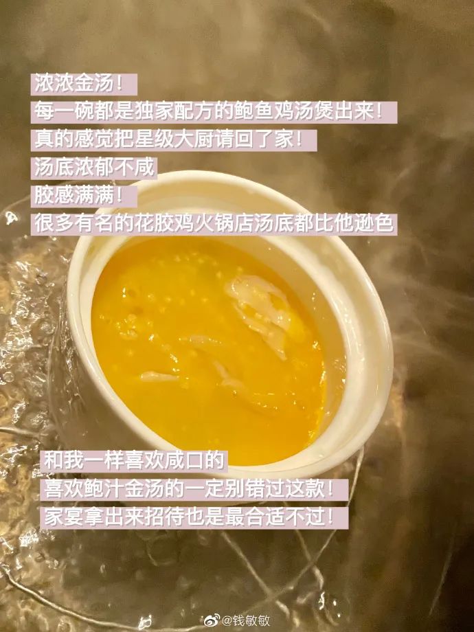 为了还原正宗的花胶鸡风味,我们特地邀请五星级酒店粤菜大厨参与研发,单单是熬制金汤就花了12小时,其中加入鲍鱼、猪骨,还有清远的走地鸡,那滋味与胶质浓郁的程度,时尚达人钱敏敏都说:比粤菜馆的花胶鸡更胜一筹。
