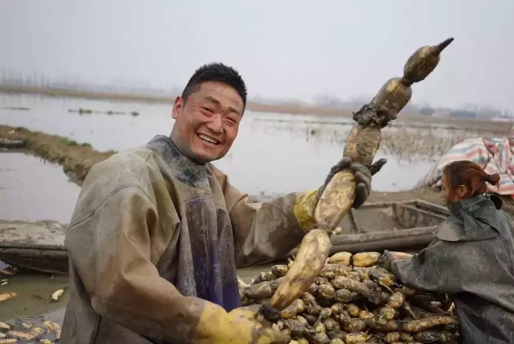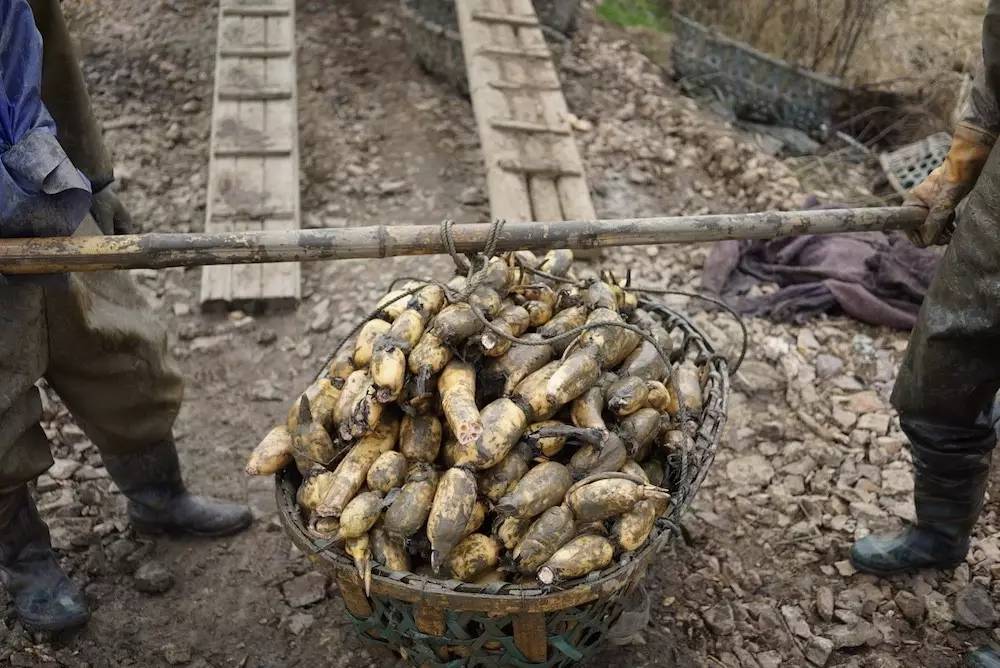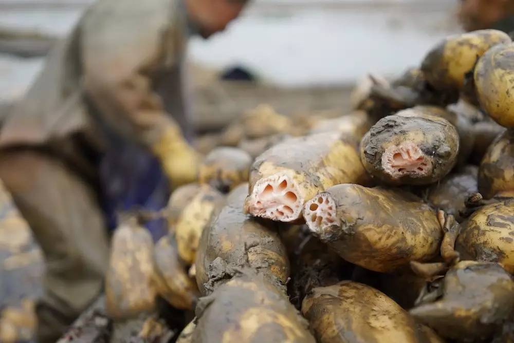 一条完整的藕是考验一个挖藕人技术的,完整的藕能尽可能的保证藕的新鲜与干净,不会因为截口与空气的接触加速变质,也不会因此有泥沙从藕的孔洞中流入。这样挖起来的藕被迅速装车,运到周边的洗藕作坊,清洗完毕后装箱当天就送往各大城市的蔬菜批发市场。我们在菜场超市买到的藕基本上都是这么来的,这些人因为长期在泥水中作业,基本都患有风湿等疾病,很是辛苦。
