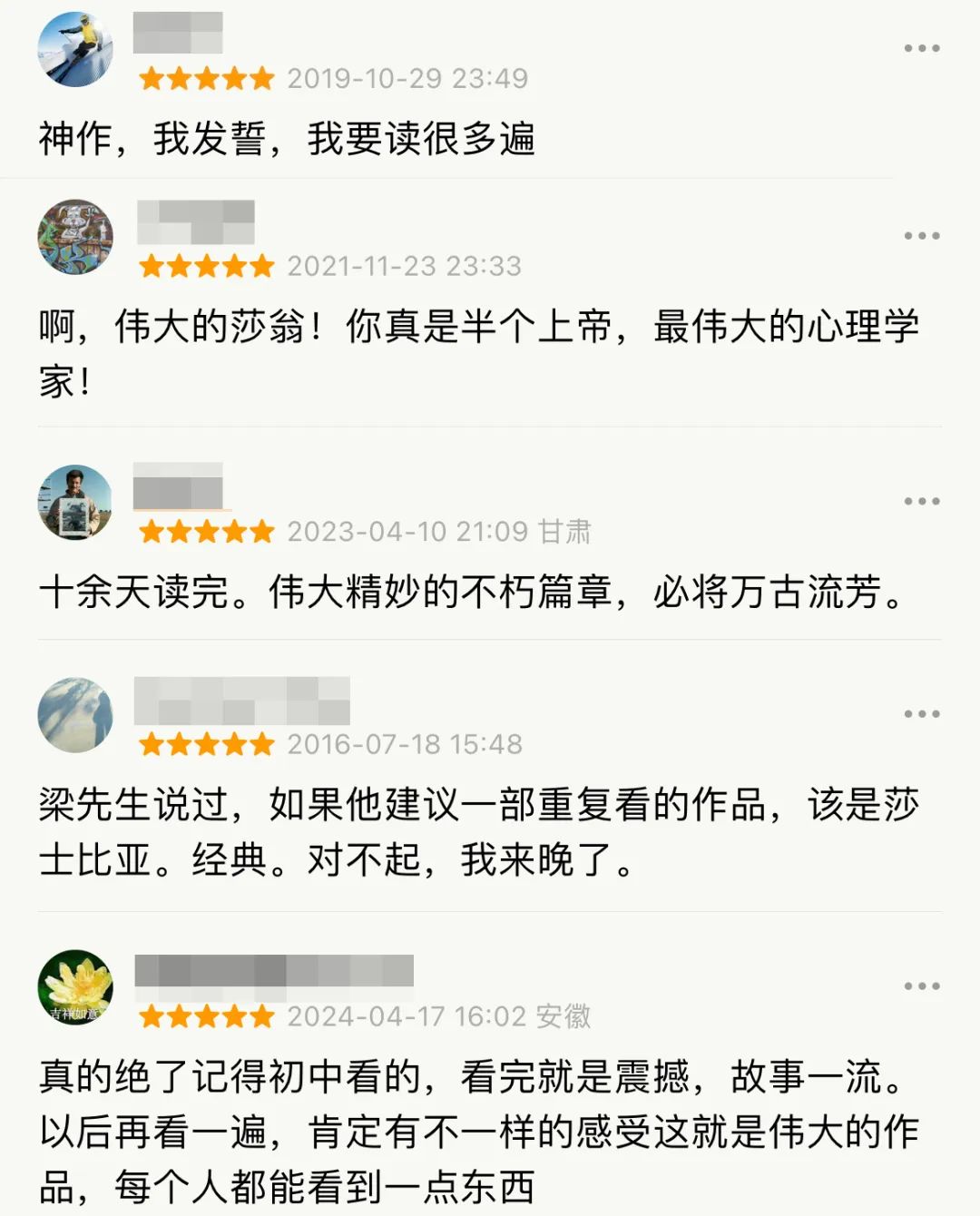 马克思称他为“人类伟大的戏剧天才”; 大仲马说:“创造至多的是莎士比亚,他仅仅次于上帝”; 歌德曾深情表白:“我读到他的第一页,就使我这一生都属于他了”; 金庸曾诚心发愿:“如果有一天能上太空,又只能带一套书,那必须是莎士比亚全集。”