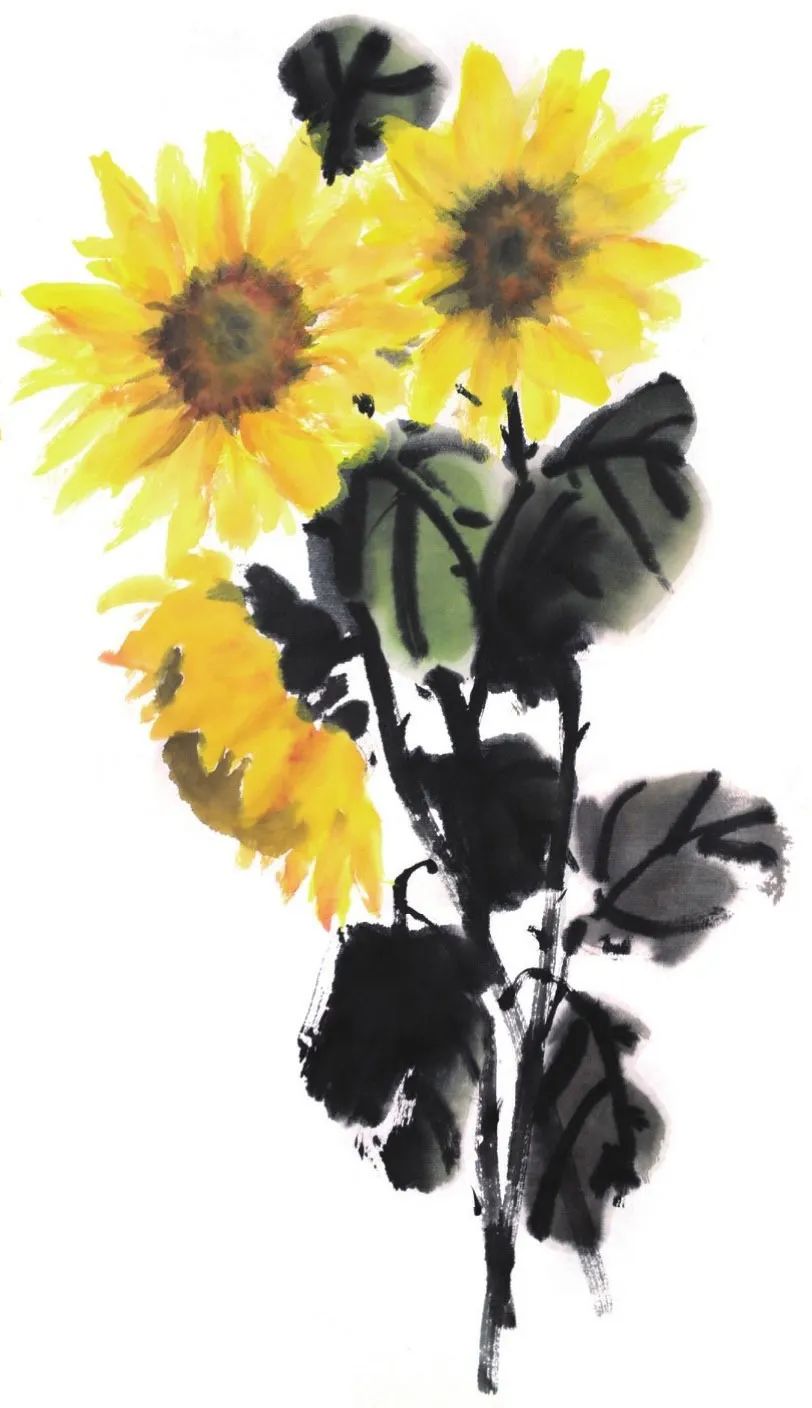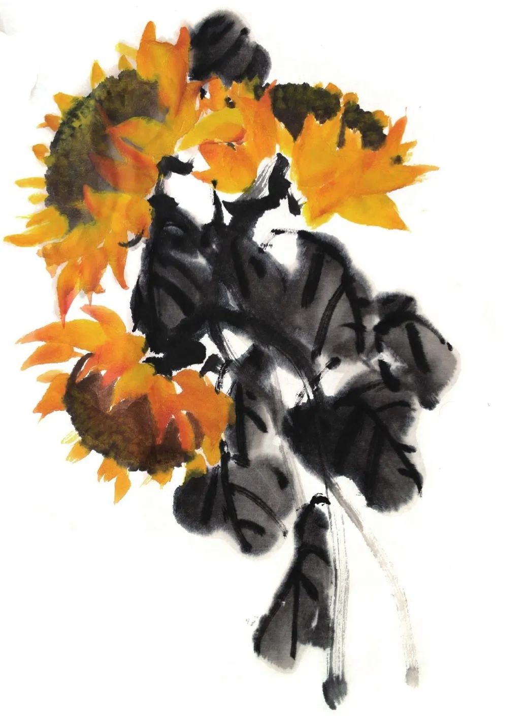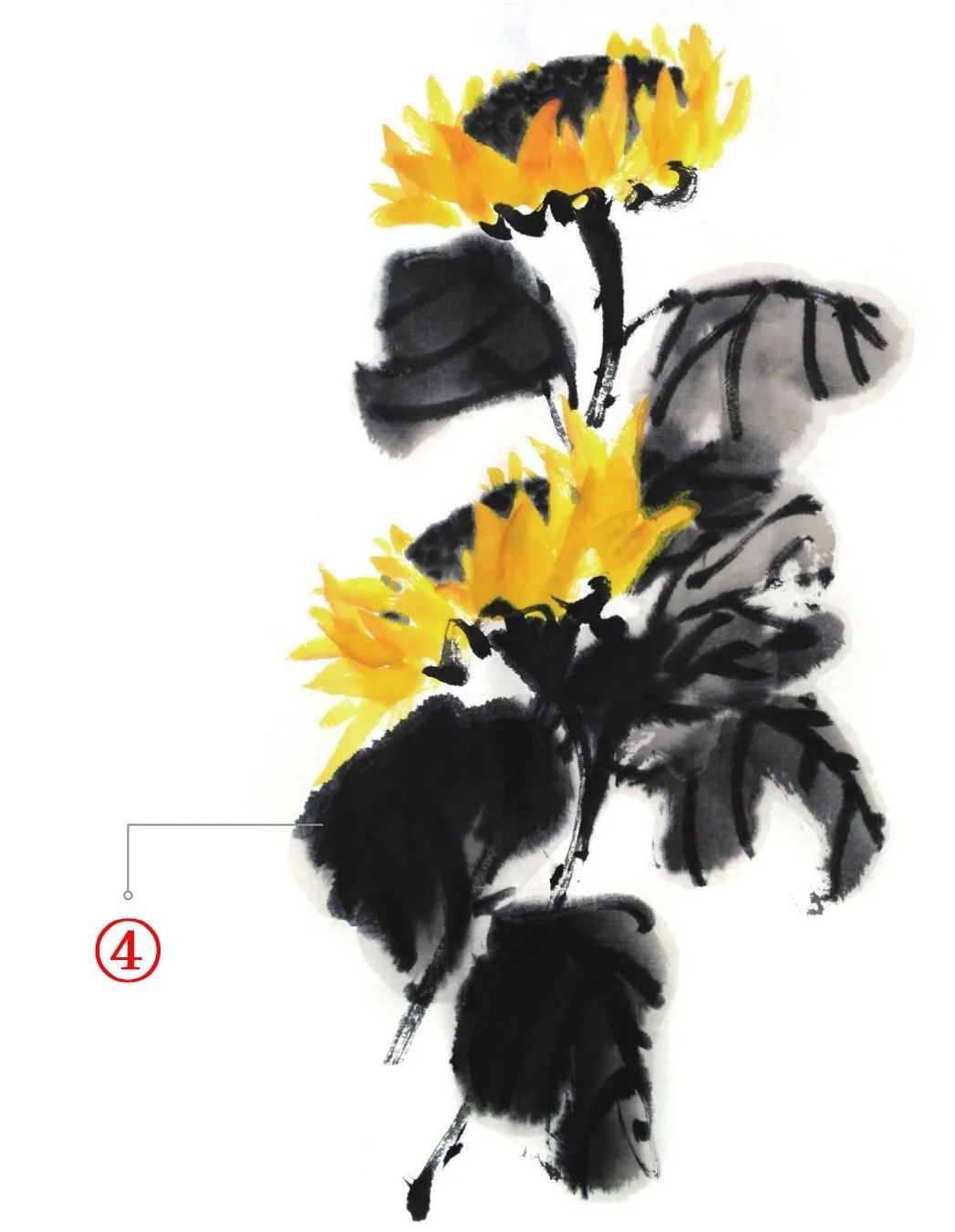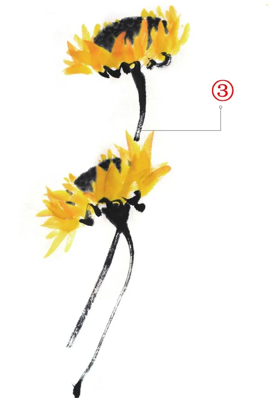 ①微微调淡藤黄,笔尖可略浓重些,绘制分散的向日葵花瓣。↓↓↓