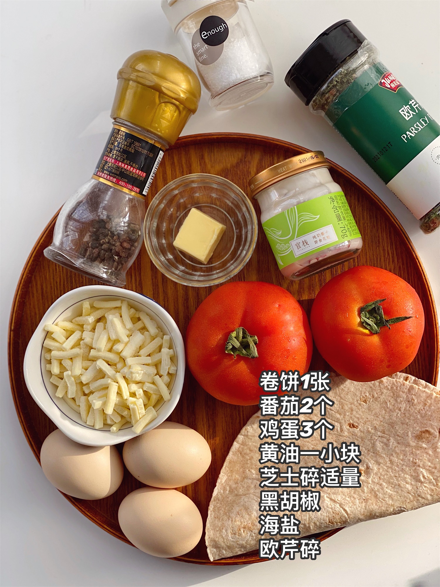 卷饼1张,番茄2个,鸡蛋3个,黄油一小块,芝士碎适量,黑胡椒,海盐,欧芹碎