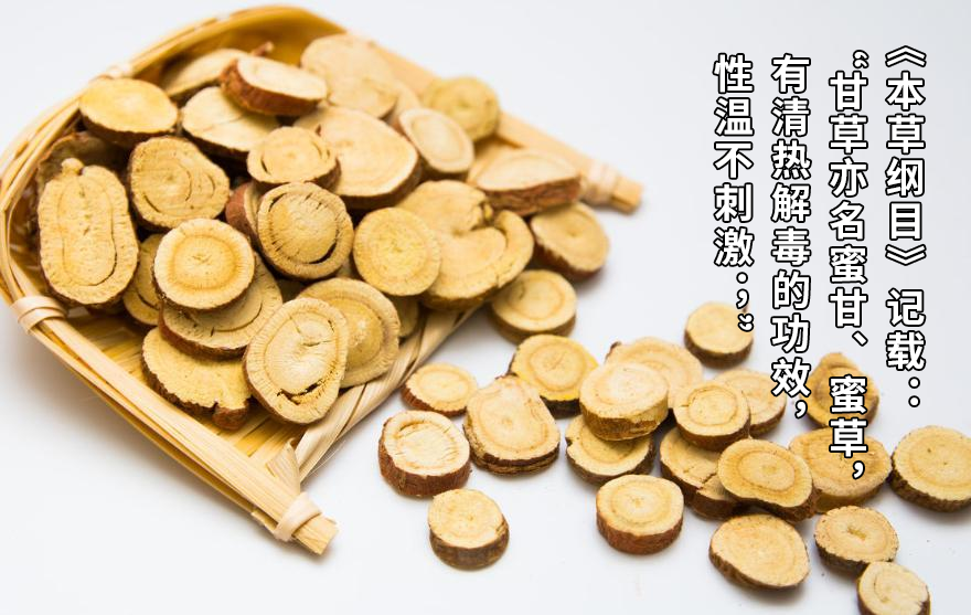 根据《本草纲目》记载:“甘草有清热解毒的功效,性温不刺激;”