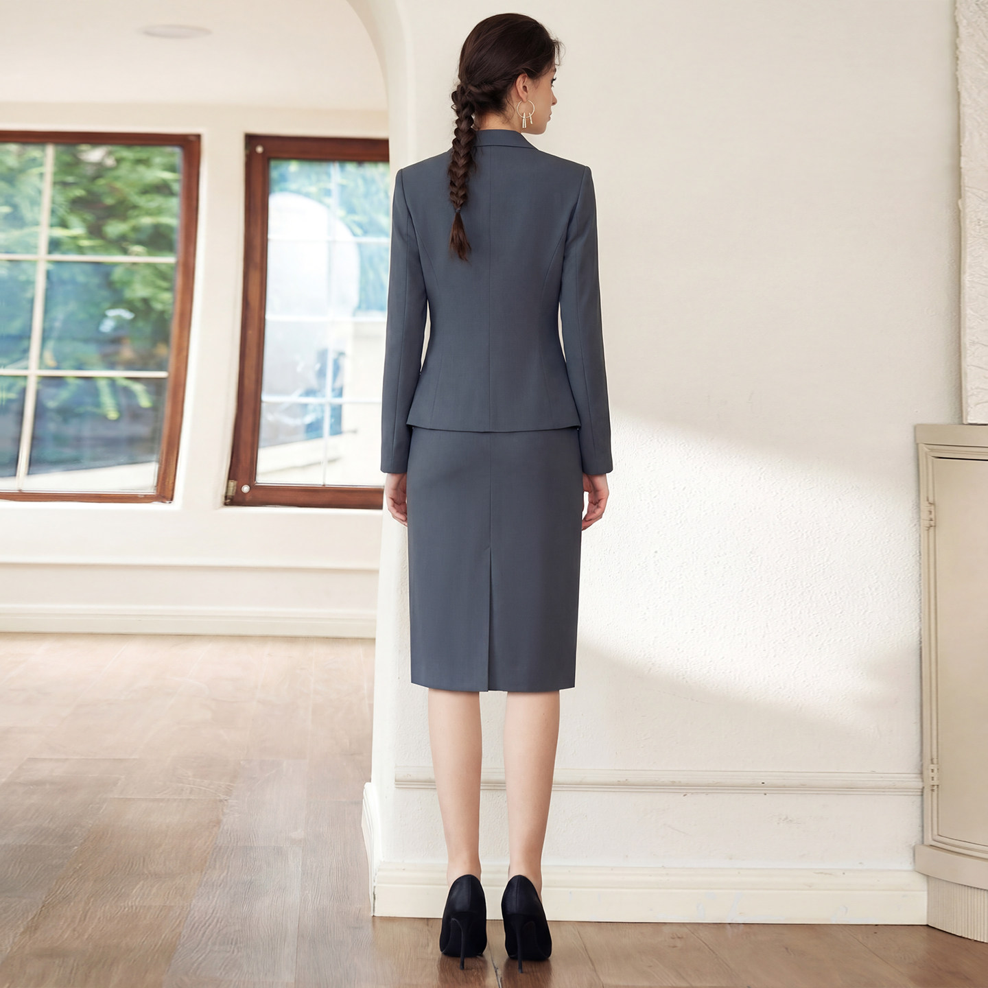 同色系包臀铅笔裙,长度刚好及膝,既勾勒出优雅曲线,又保持了职业装的端庄得体;后开叉设计则兼顾了行动的便利性,让你在忙碌的工作中也能步履轻盈。