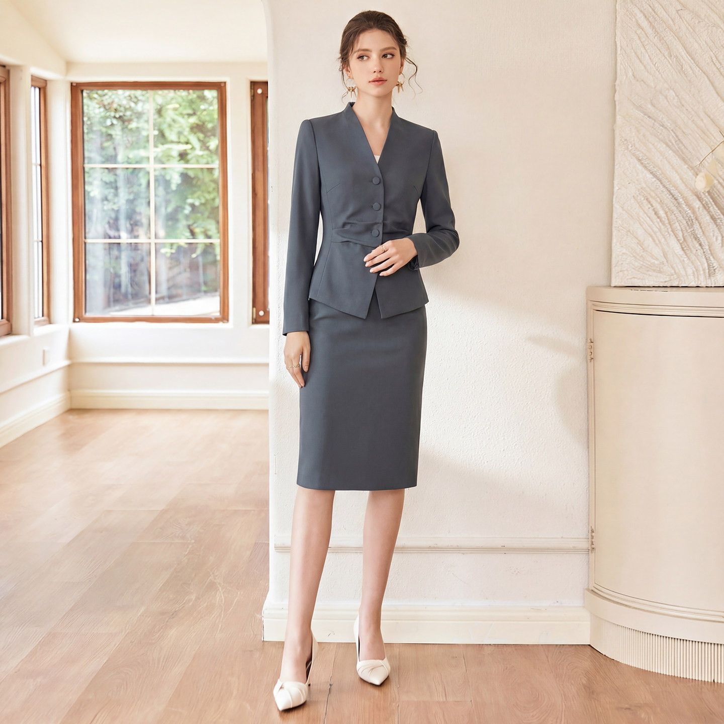这款雾灰色西装两件套,以低饱和的高级色调与利落剪裁,重新定义了职业装的时尚边界,让你在会议室与谈判桌前,都能从容自信
