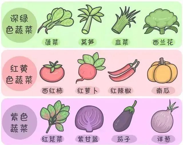 每天最好吃够5种颜色的蔬果,不同颜色的蔬果包含不同的营养元素。如:花青素、花绿素、叶黄素、叶青素等就会使食物表现为不同的颜色。五颜六色的蔬菜搭配起来,有助于摄入多种营养素。
