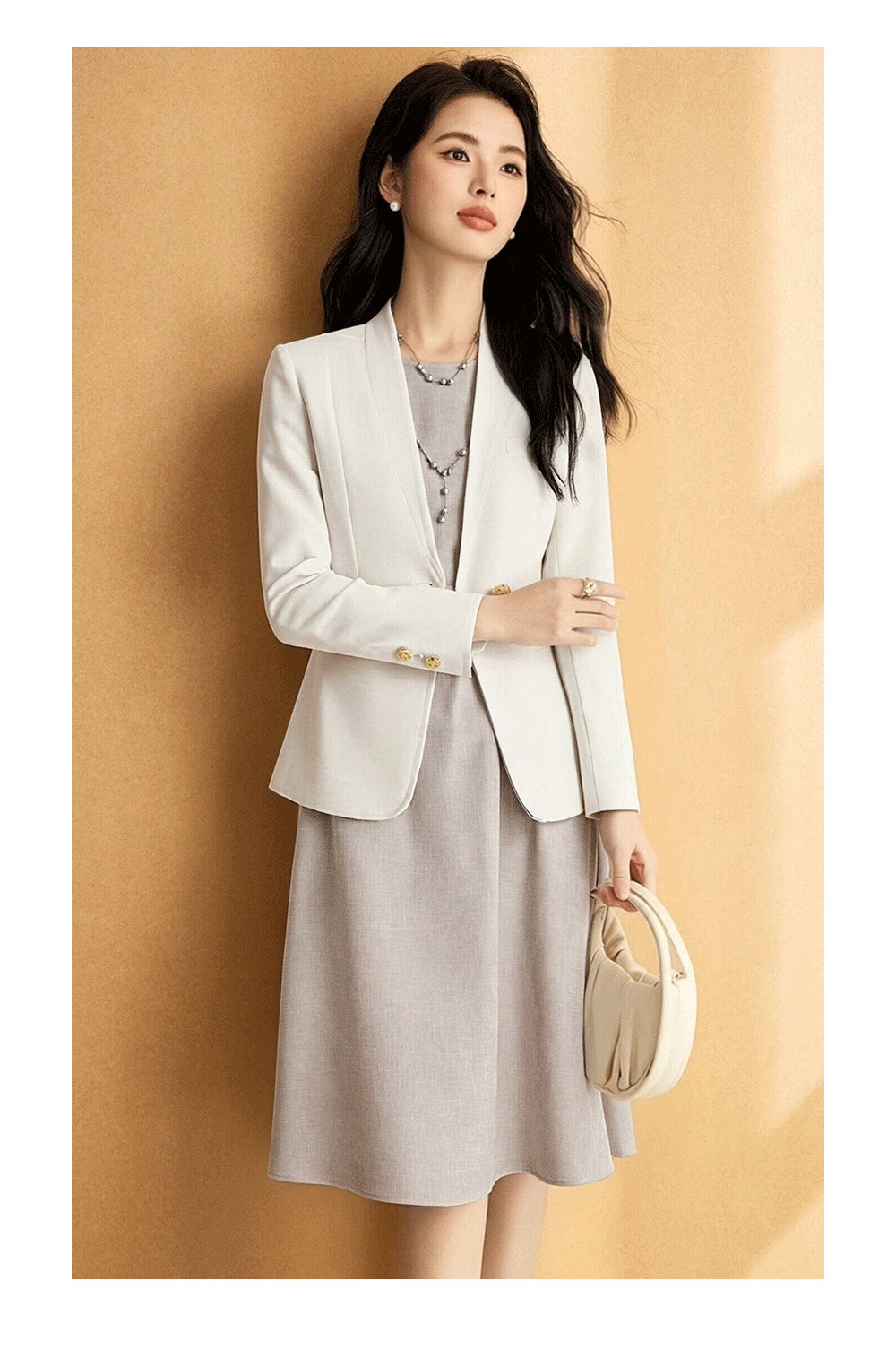 衣长恰好覆盖腰线,搭配浅卡其连衣裙,形成层次分明的视觉效果,既显高挑又不失温婉。