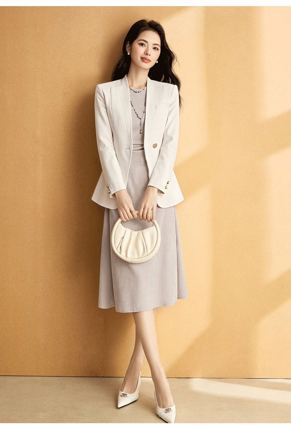 无领设计打破常规,线条干净利落,单颗金属纽扣成为视觉焦点,既简化了穿搭步骤,又提升了整体精致度
