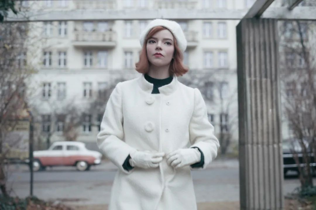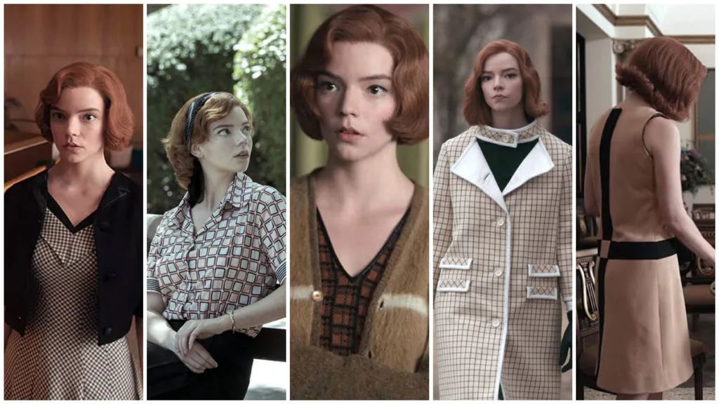 剧中女主Beth Harman,穿连衣裙配开衫时,一看就是养在温室里的乖乖女。