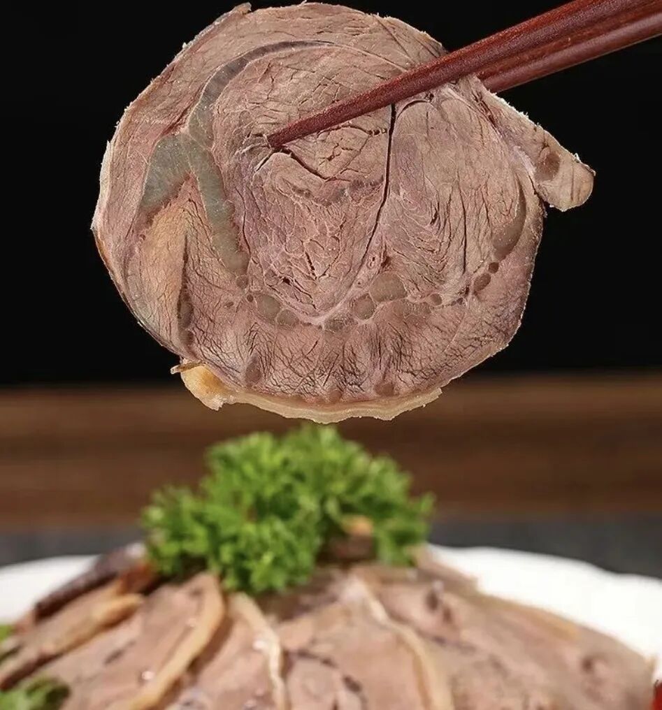 腱子心也叫金钱腱,肉质更鲜嫩些,中间带有小花筋,呈现漂亮的放射状纹路。去除腱子心,剩下像龟壳一样的就是龟腱。