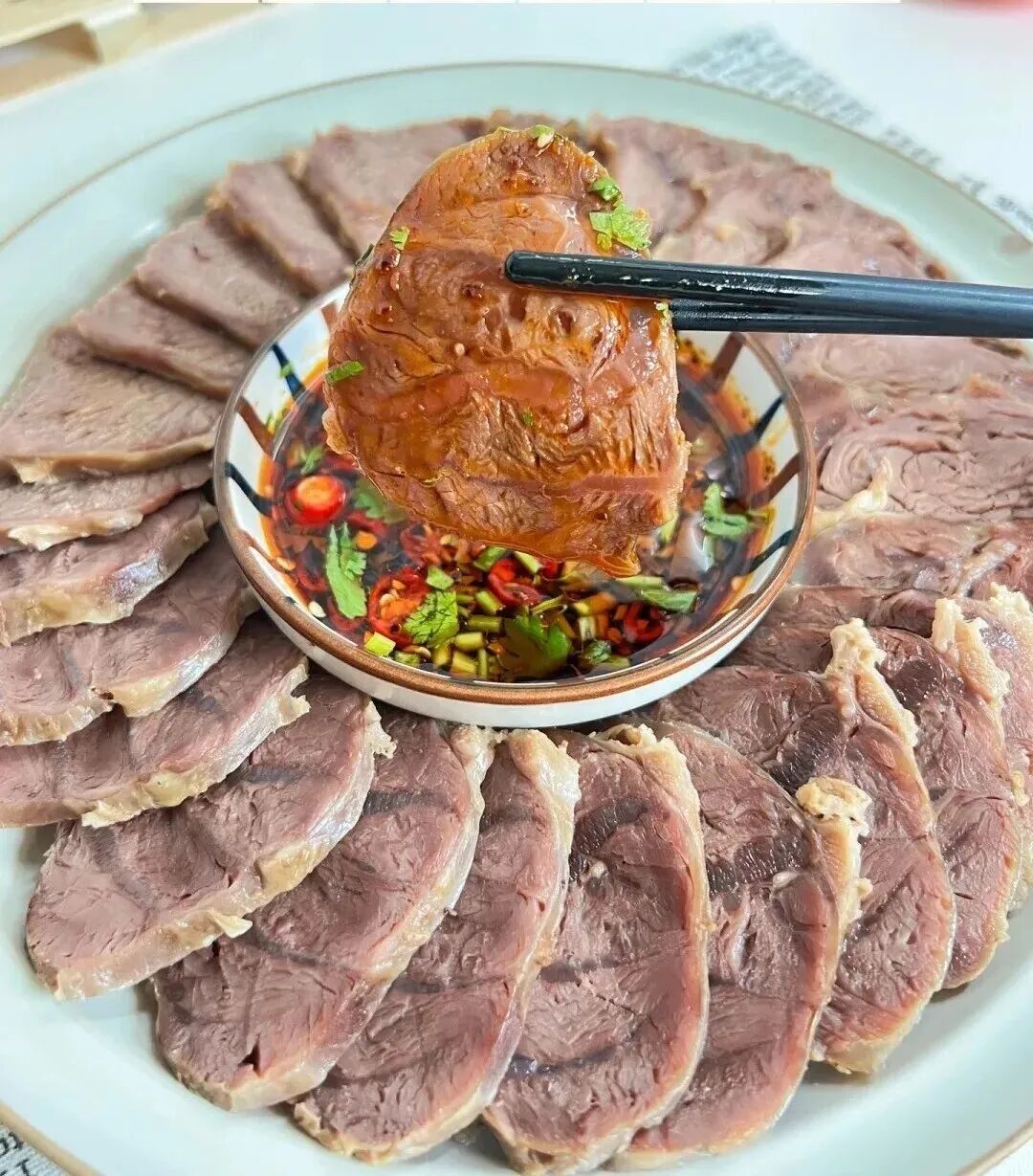 将牛腱子清水煮熟后切成薄片,肉质鲜嫩,筋肉交错,弹性十足,不带腥味也不会有异味。