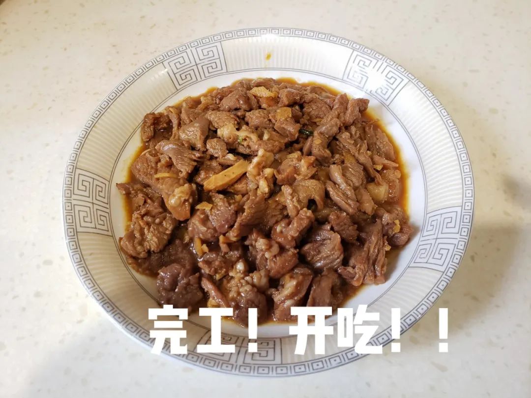 油锅煸炒蒜泥姜末后,倒入腌制好的牛肉,迅速翻炒1分钟,
