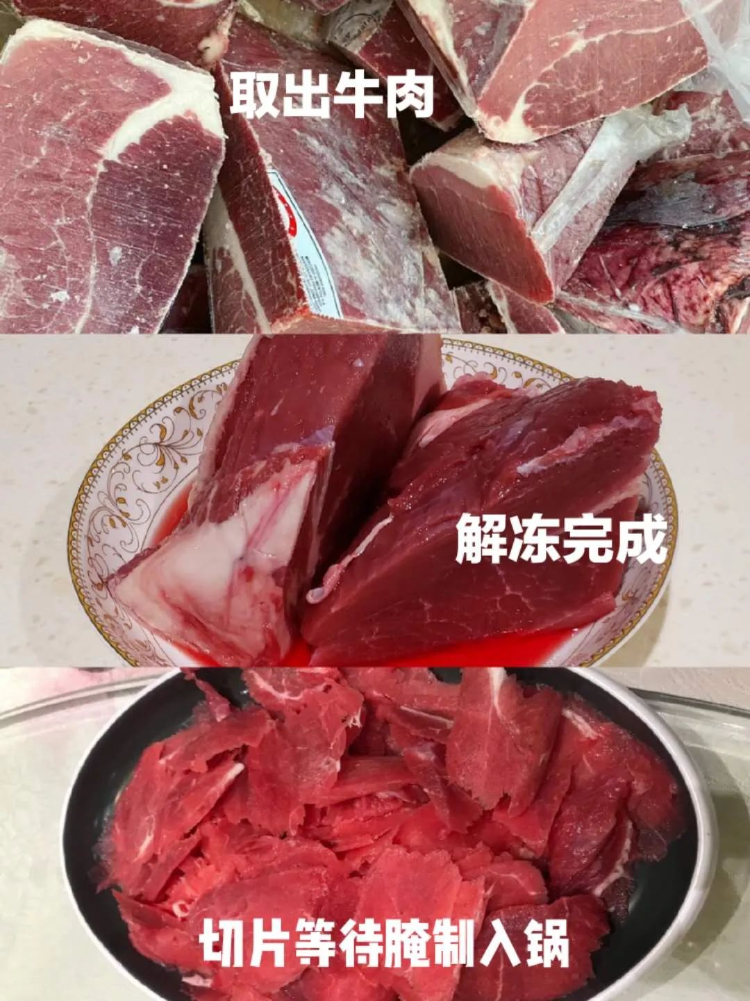 从冰箱里取出一块牛肉,自然半解冻时最好切,