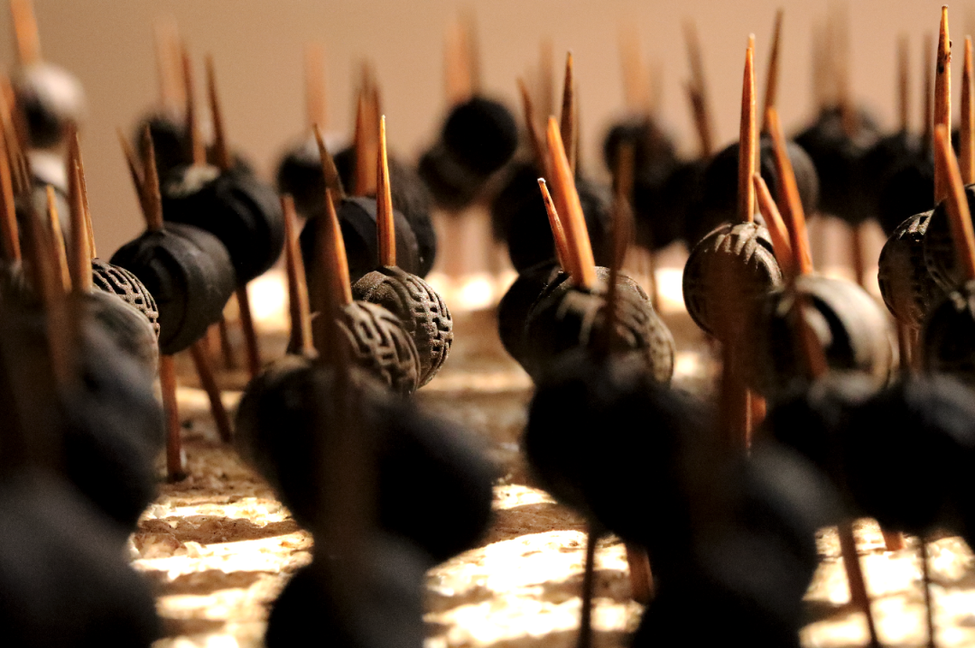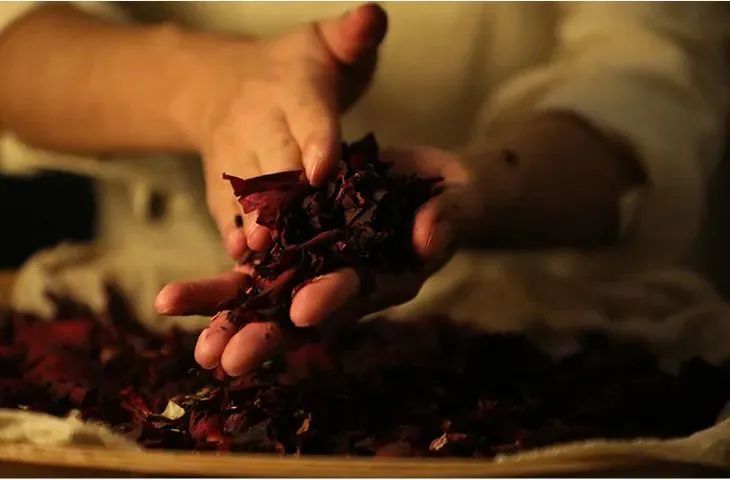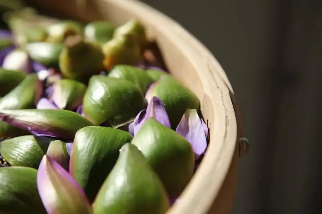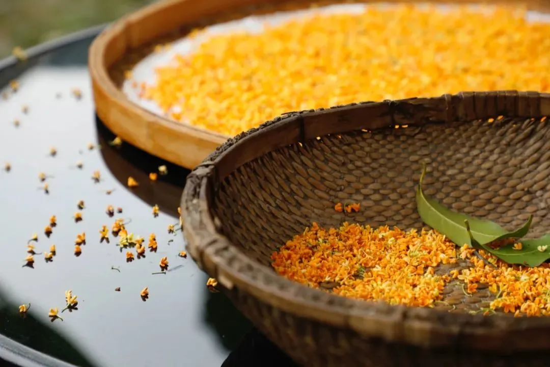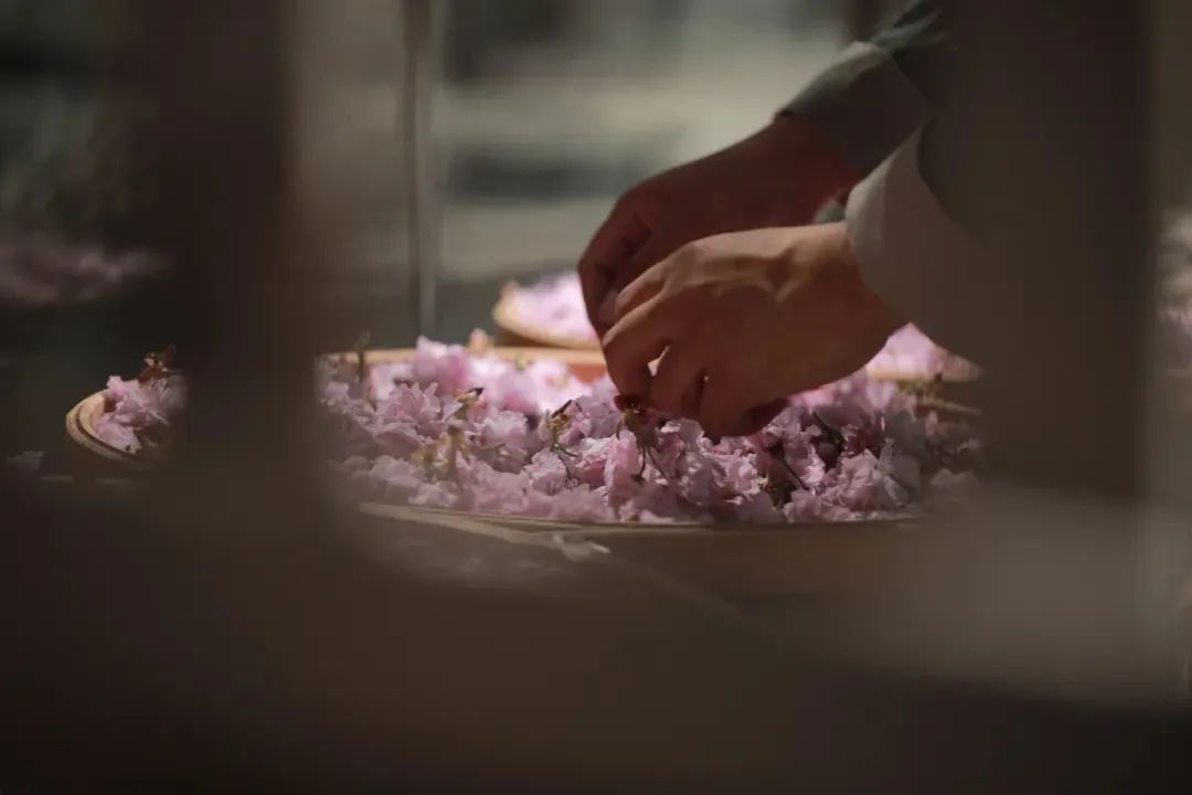 新鲜花材置于凝脂之上,使其慢慢吸收花香。这道工序也叫“窨”(ⅹun),同“熏”。