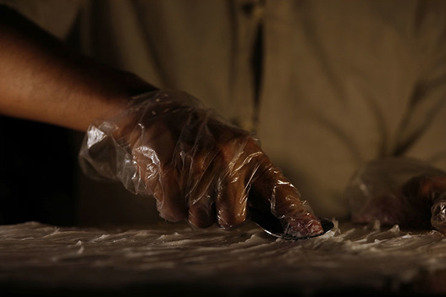 五千年传统“冷吸法”:在玻璃板上涂满、铺平混合了花油的凝脂。