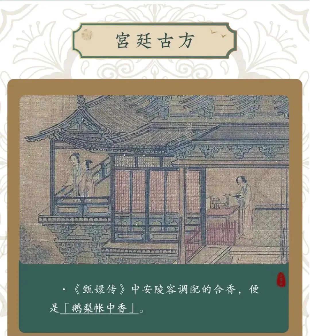 文人雅士的最爱:因为甄嬛传而被人所熟知的“鹅梨帐中香”,用到的香材有澳洲檀香、越南沉香、梨、温桲、楠木皮粉、蜂蜜等。