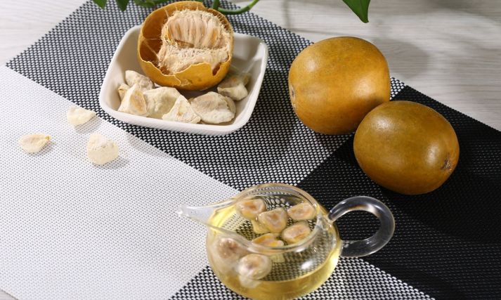 橘红果和罗汉果一起做成“罗汉果橘红茶”,在罗汉果茶中融入了橘红果的香气,橘红果皮也有罗汉果的甘醇,两种味性互补的食材交融在一起,令人在浓厚的汤色中品味到回甘和橘香,是理气扶正和解腻开胃的好茶。