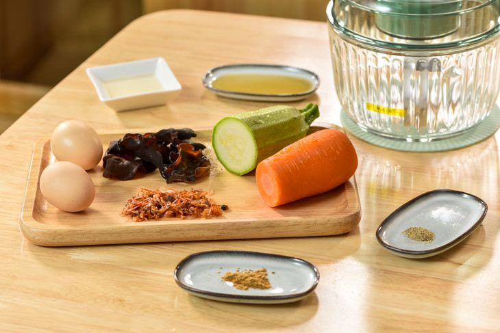 3、将西葫芦、胡萝卜、木耳、虾皮分别放入绞肉机 中,选择“1档”绞打30秒。