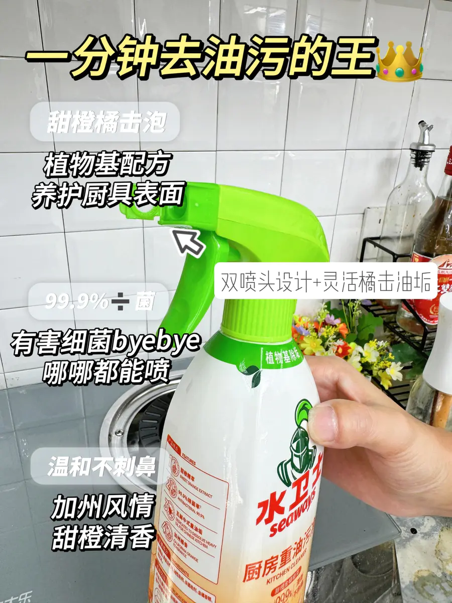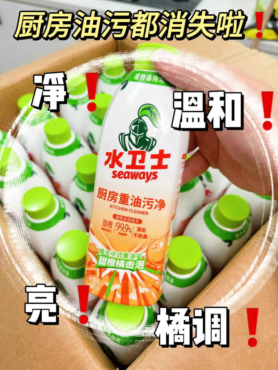厨房油污真的很令人头疼,油垢很厚重总去不掉,每次用抹布擦掉还是黏糊糊的😖 安利下我们的水卫士油污净——甜橙橘击泡!