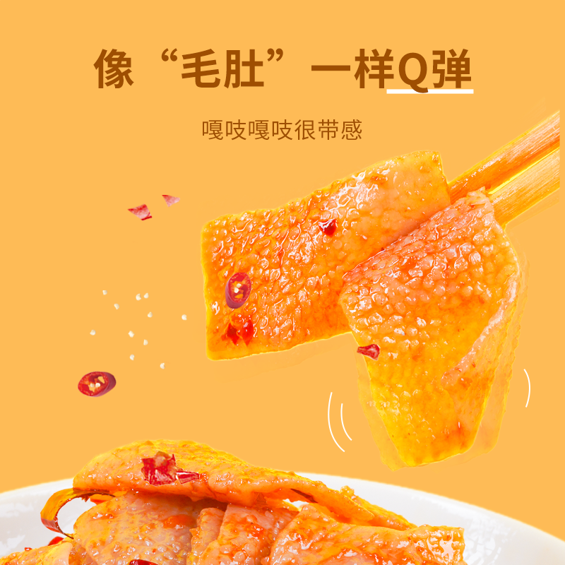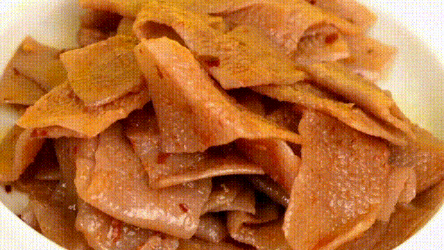 整体的辣味比豆腐干(辣味)要辣!吃起来还真觉得跟毛肚没什么区别,Q弹爽口,嚼起来微脆还有点韧劲;