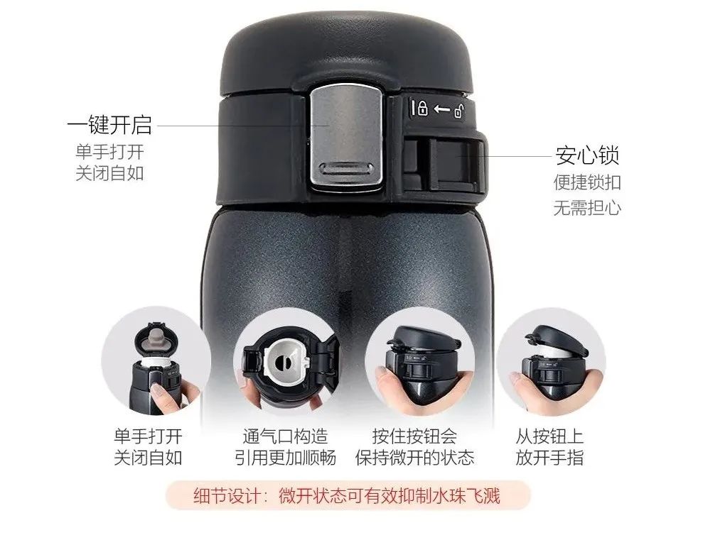 水杯开口打开静止设计,当打开水杯的时候,盖子会停留1秒再弹开,这样热水就不会喷在脸上