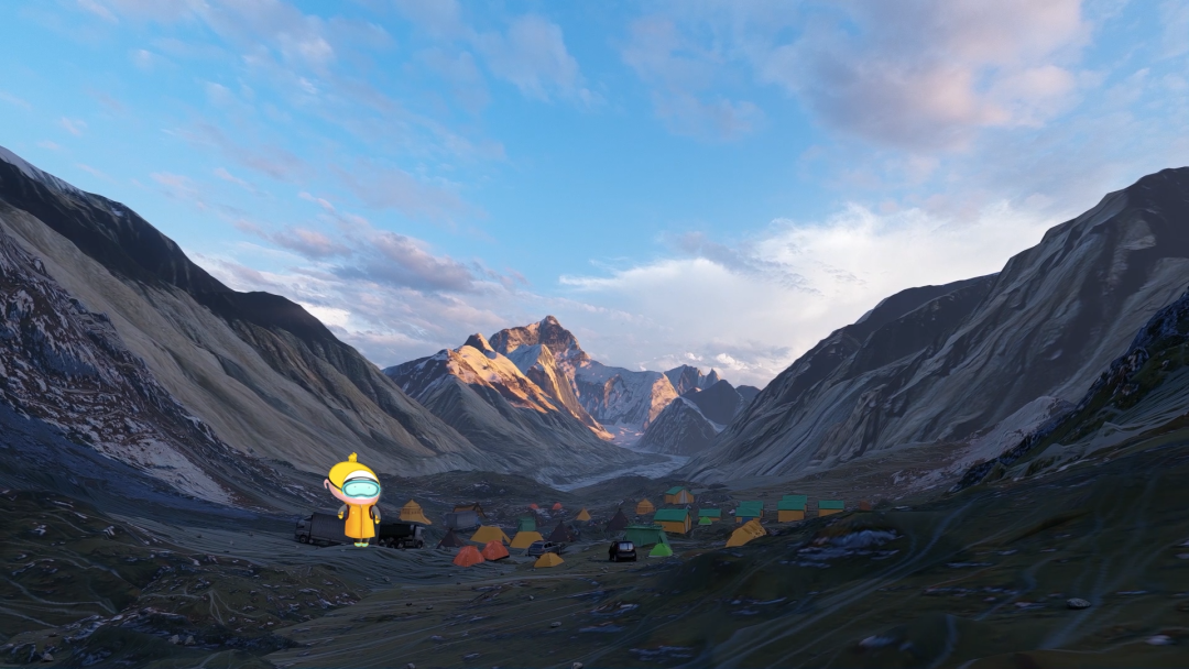为了用3D还原出珠穆朗玛峰和真实的珠峰大本营,白泽团队靠科学家提供的现场影音视频及图片,一点点调整大本营现场的样貌,调整它和珠峰的相对角度和位置,最终才呈现出了真实还原的效果。
