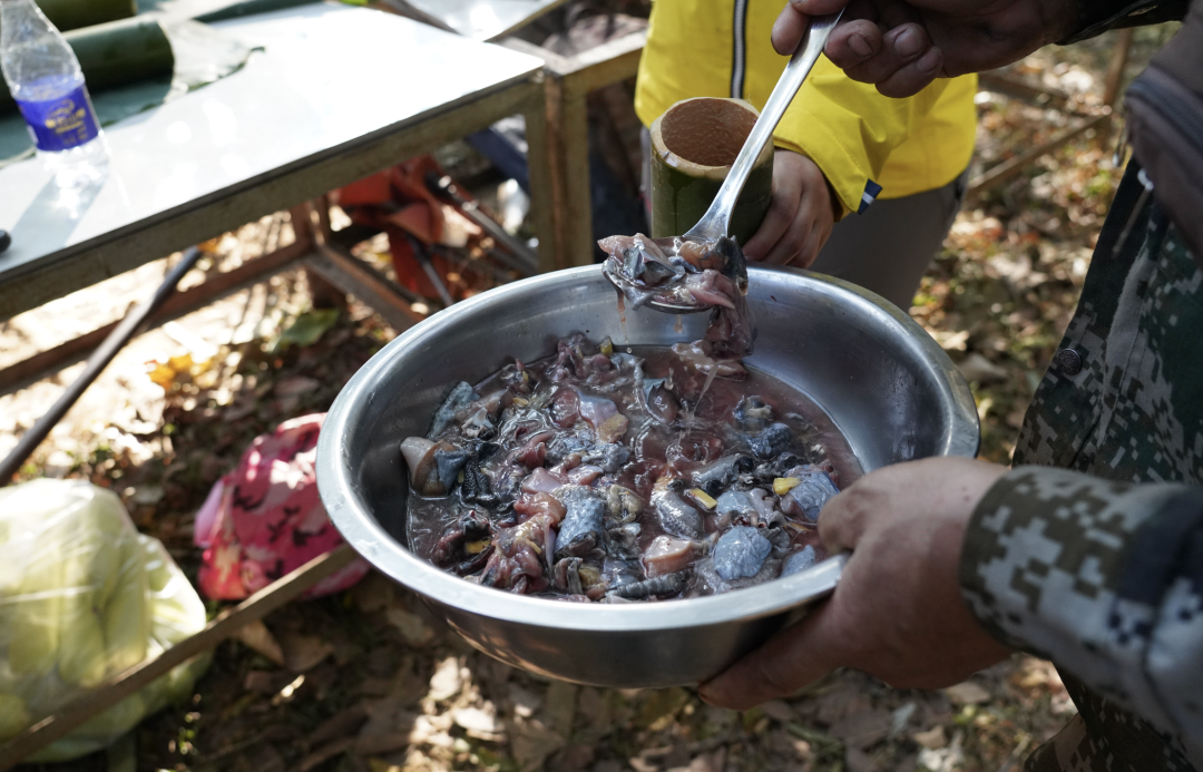 在徒步时摘下的野橄榄淋上辣椒面又成了另一番风味;刚刚砍下的竹子装上调好味的鸡肉和水,放到火上烤一烤,半小时后便能成鲜美的鸡汤,塞住竹筒口的还是前往攀树小路上摘下的芭蕉叶……从原料、到工具、到口味都是纯正的傣家、雨林风味。