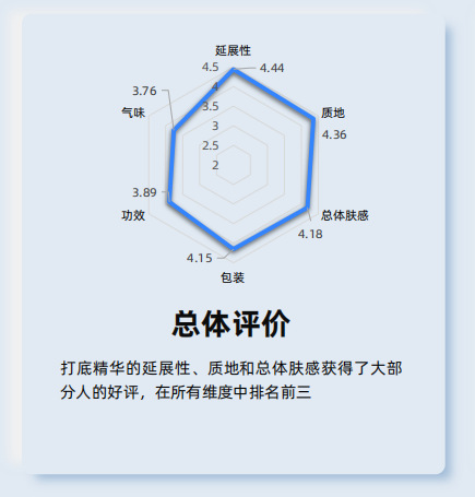 清爽质地 和 延展性最受欢迎,都是4.3以上的高分,包装和肤感上,也得到认可。