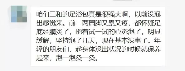因为对睡眠改善有奇效,“三和温通足浴包”成了老妈目前唯一接受的保健产品,而且每天会主动催促我为她准备泡脚水(以前她总嫌泡脚麻烦)。