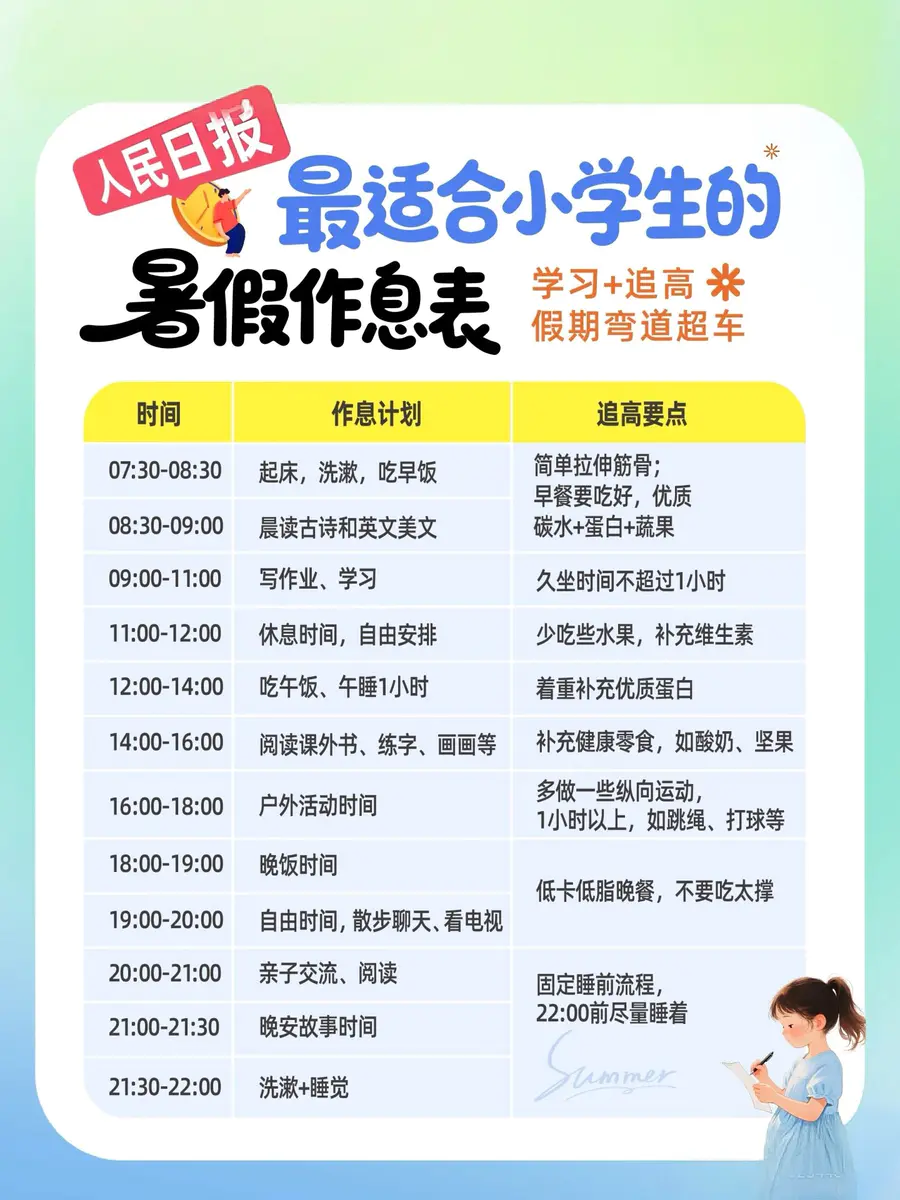 暑假如何让孩子玩得开心,高效学习、悄悄长高? 人民日报推荐的“暑假作息作息表”,学习规划+身高管理👌