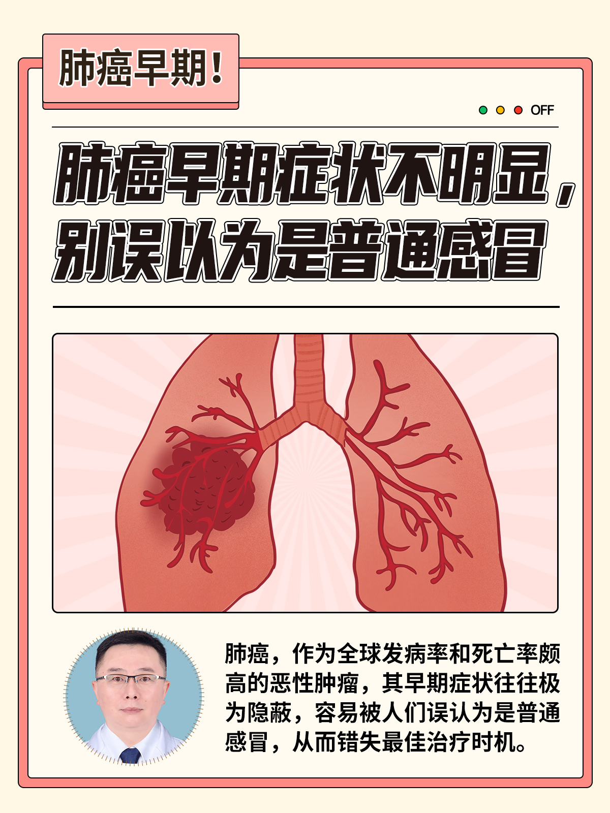 并且肺癌最初发病的症状很不明显,很多人都以为是小感冒或者咽炎,咳嗽几声吃点药就能过去……